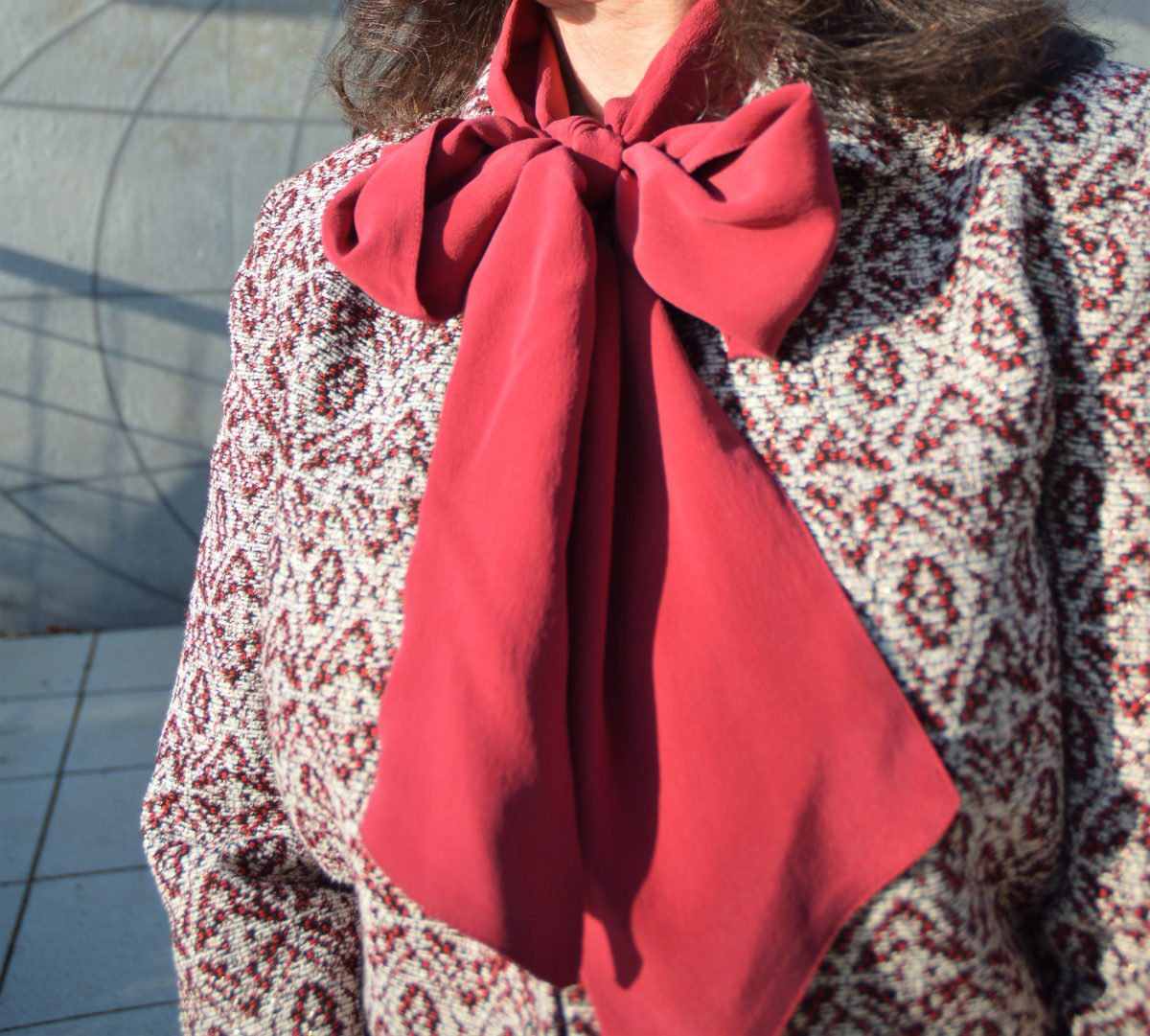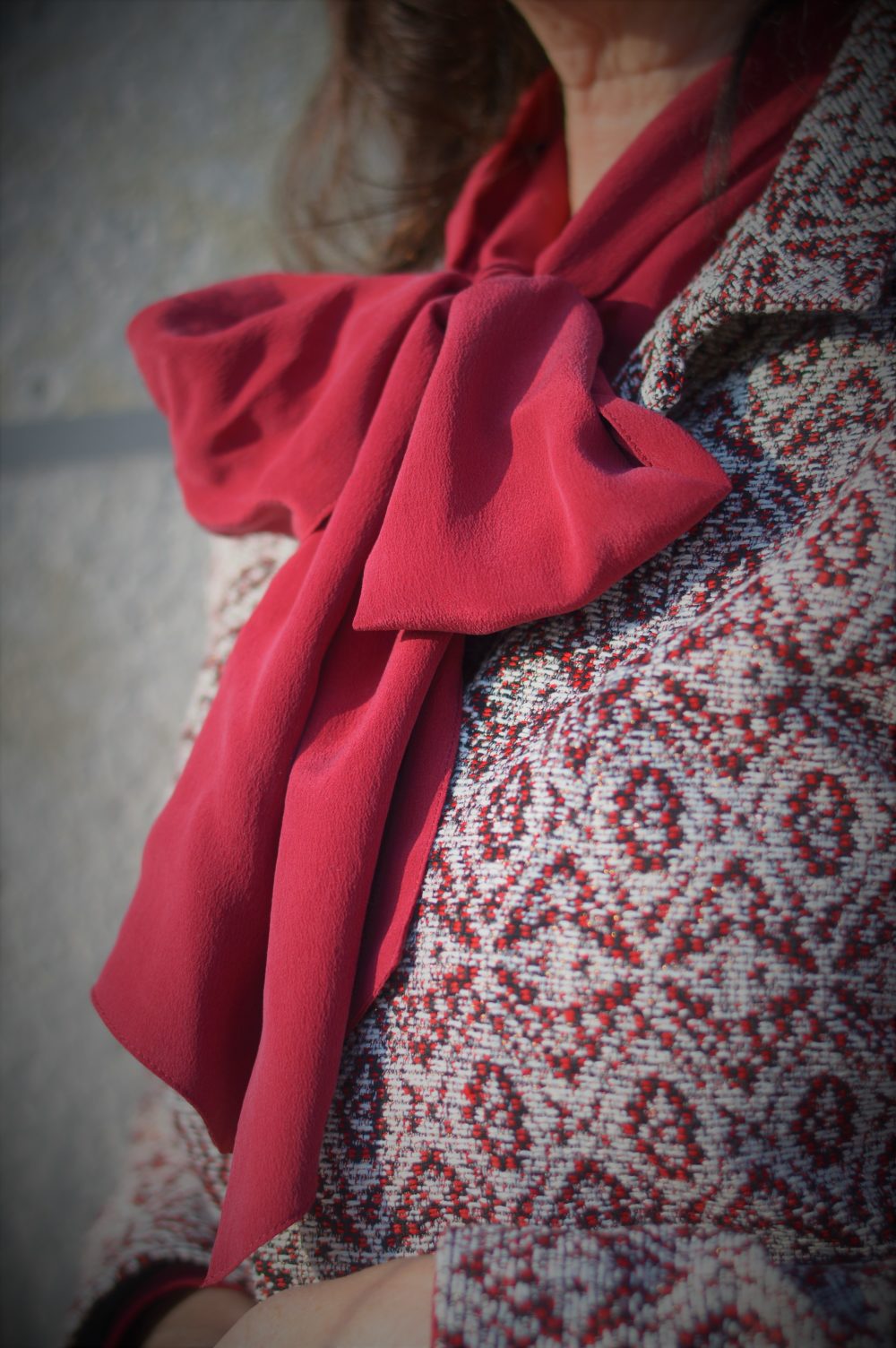 Die kostbare Seidenbluse in dem außergewöhnlichem Rotton kombiniere mit einem Lederrock mit Spitze. Weiblichkeit und pure Eleganz verkörpern meinen Stil. Der kürzer geschnittene Blazer nimmt die Farbigkeit der Bluse in seiner Musterung perfekt auf.