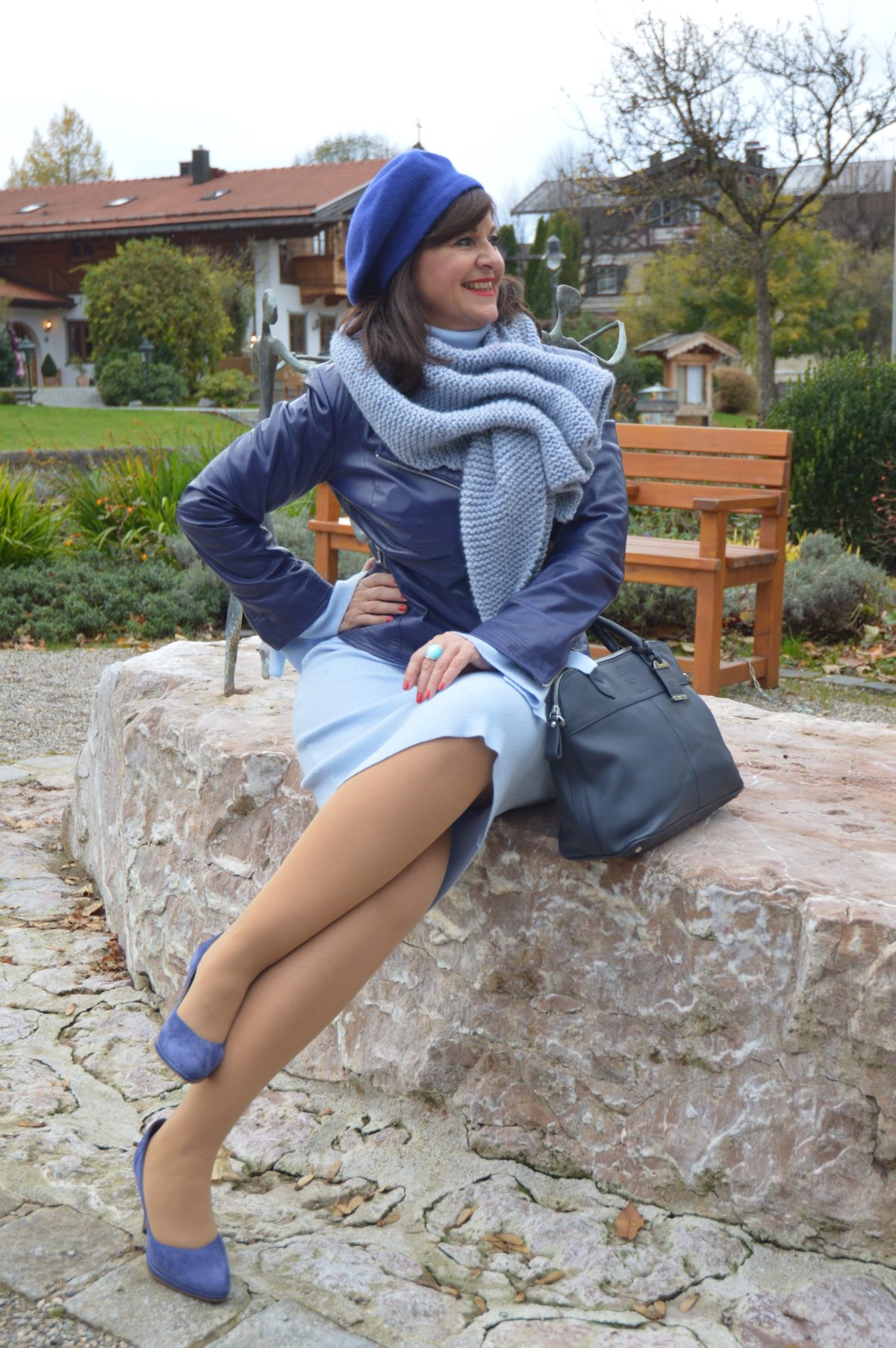 Strick u Leder – wow . und die Blautöne. Mir gefällt dieses Outfit sehr gut.