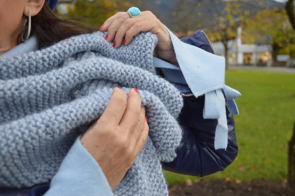 Strick u Leder – wow . und die Blautöne. Mir gefällt dieses Outfit sehr gut.