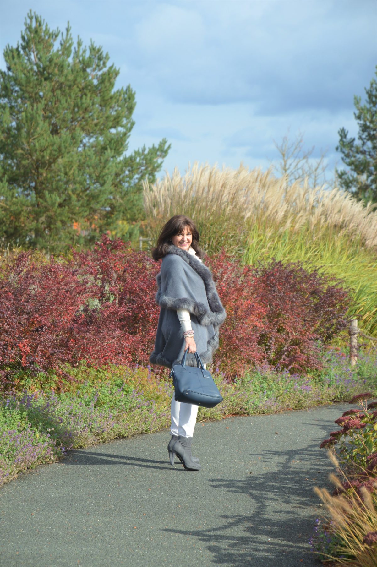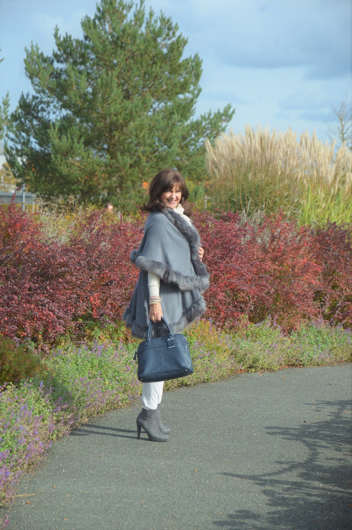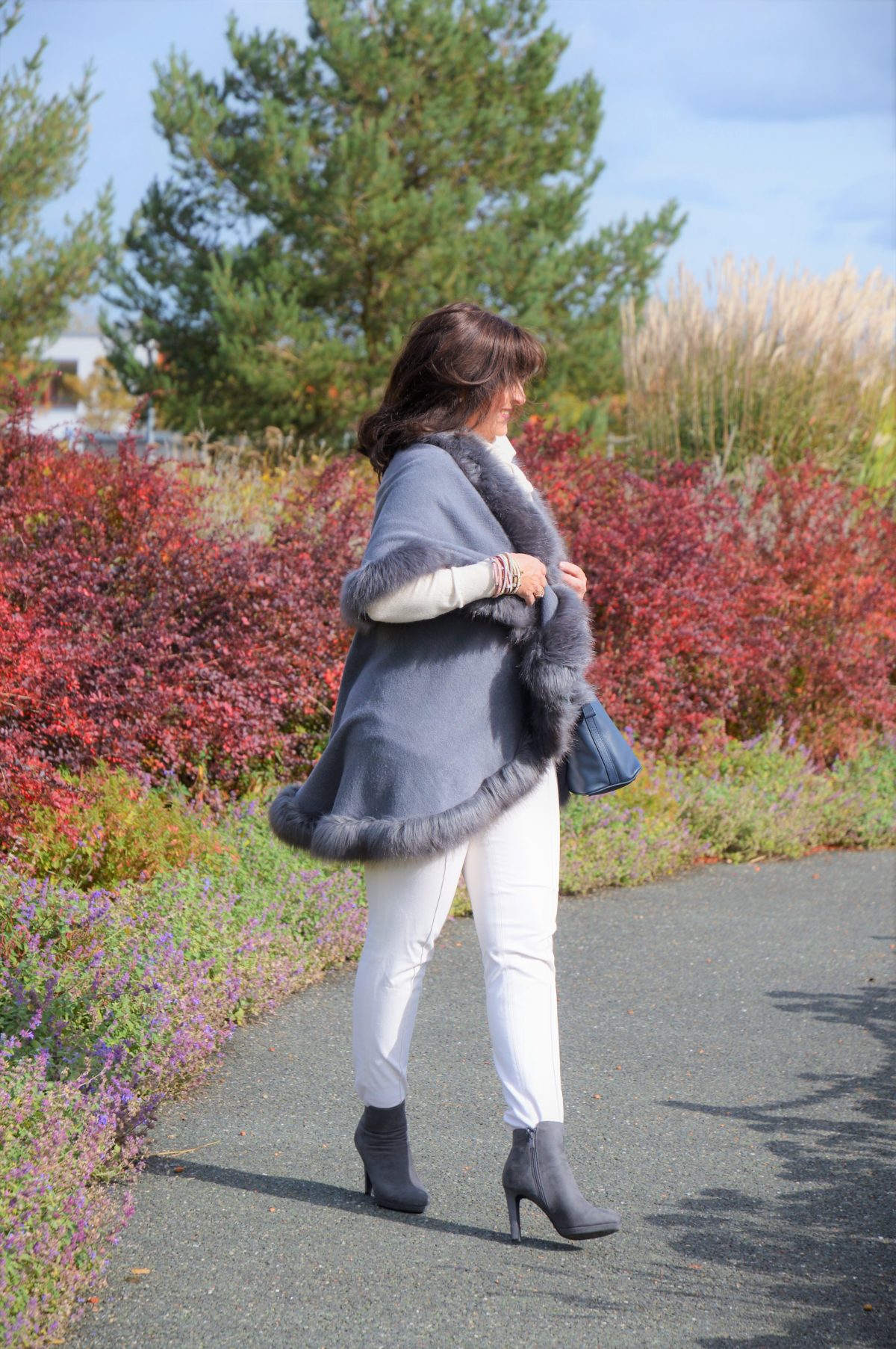 Mein sportiver Look in Wollweiß wird mit meinen Poncho in Rauchblau kombiniert. Die Wirkung ist zwar eher lässig, gleichzeitig strahlt der Poncho eine Art easy Eleganz aus. Zu meinem Longpulli kombiniere ich meine Steghose. Rauchblaue Stiefeletten ergänzen die Farbigkeit der Ponchos.