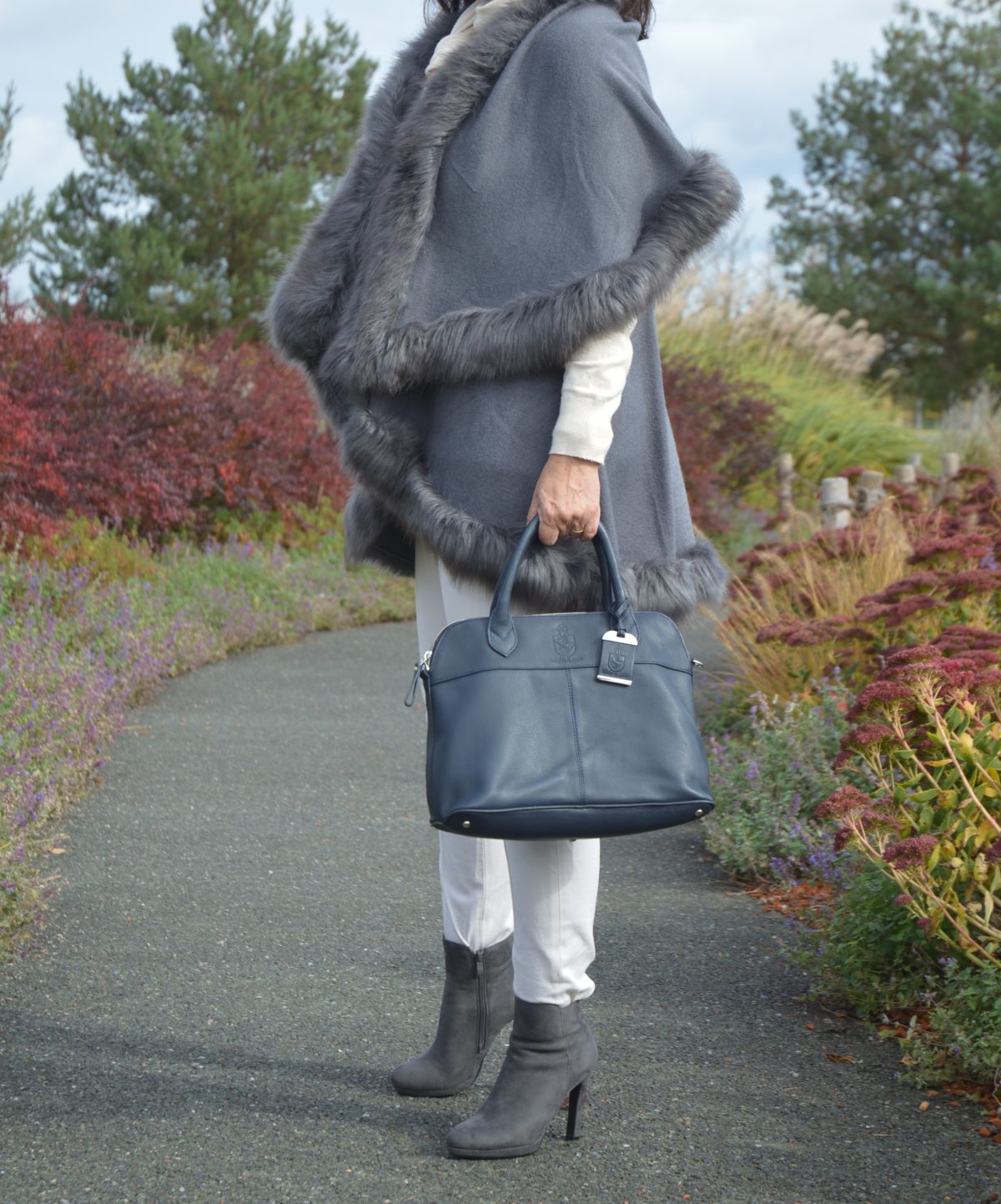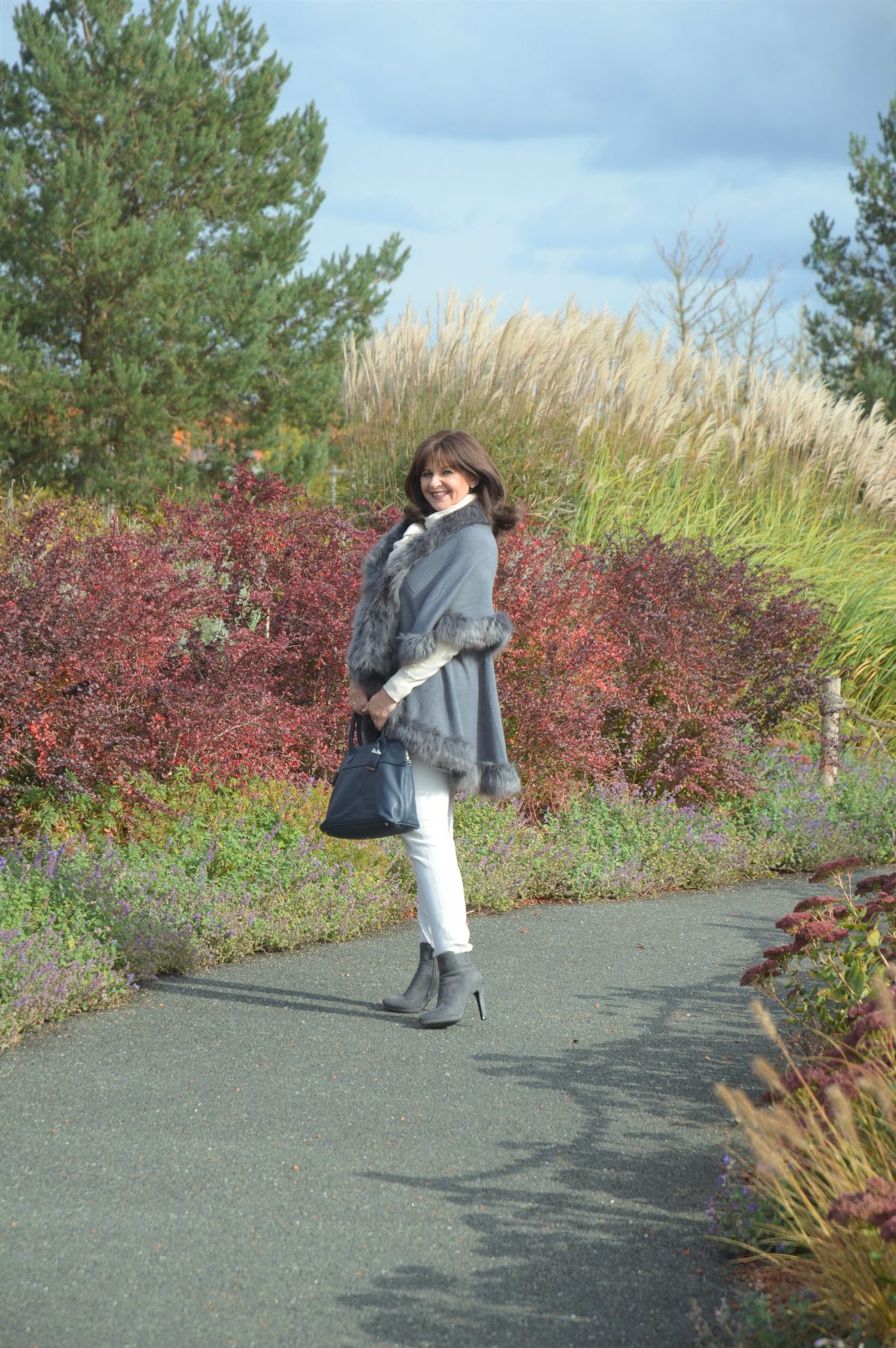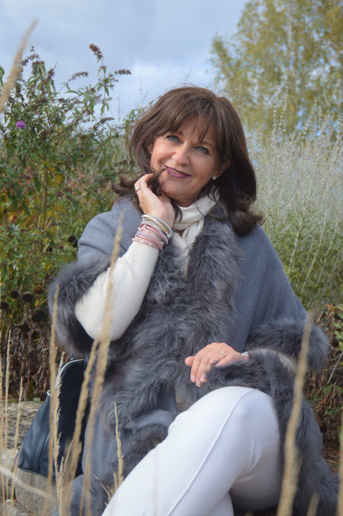 Mein sportiver Look in Wollweiß wird mit meinen Poncho in Rauchblau kombiniert. Die Wirkung ist zwar eher lässig, gleichzeitig strahlt der Poncho eine Art easy Eleganz aus. Zu meinem Longpulli kombiniere ich meine Steghose. Rauchblaue Stiefeletten ergänzen die Farbigkeit der Ponchos.