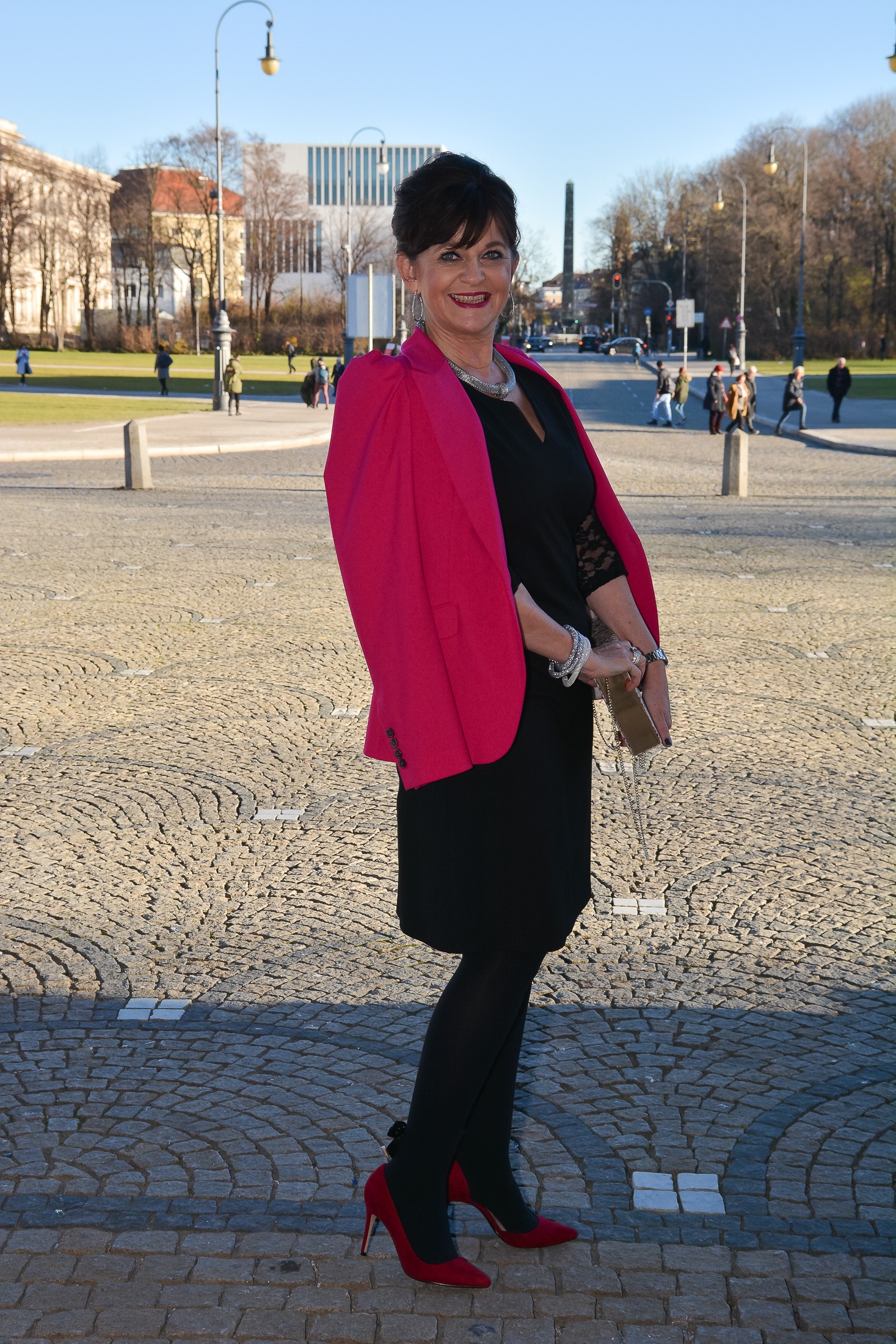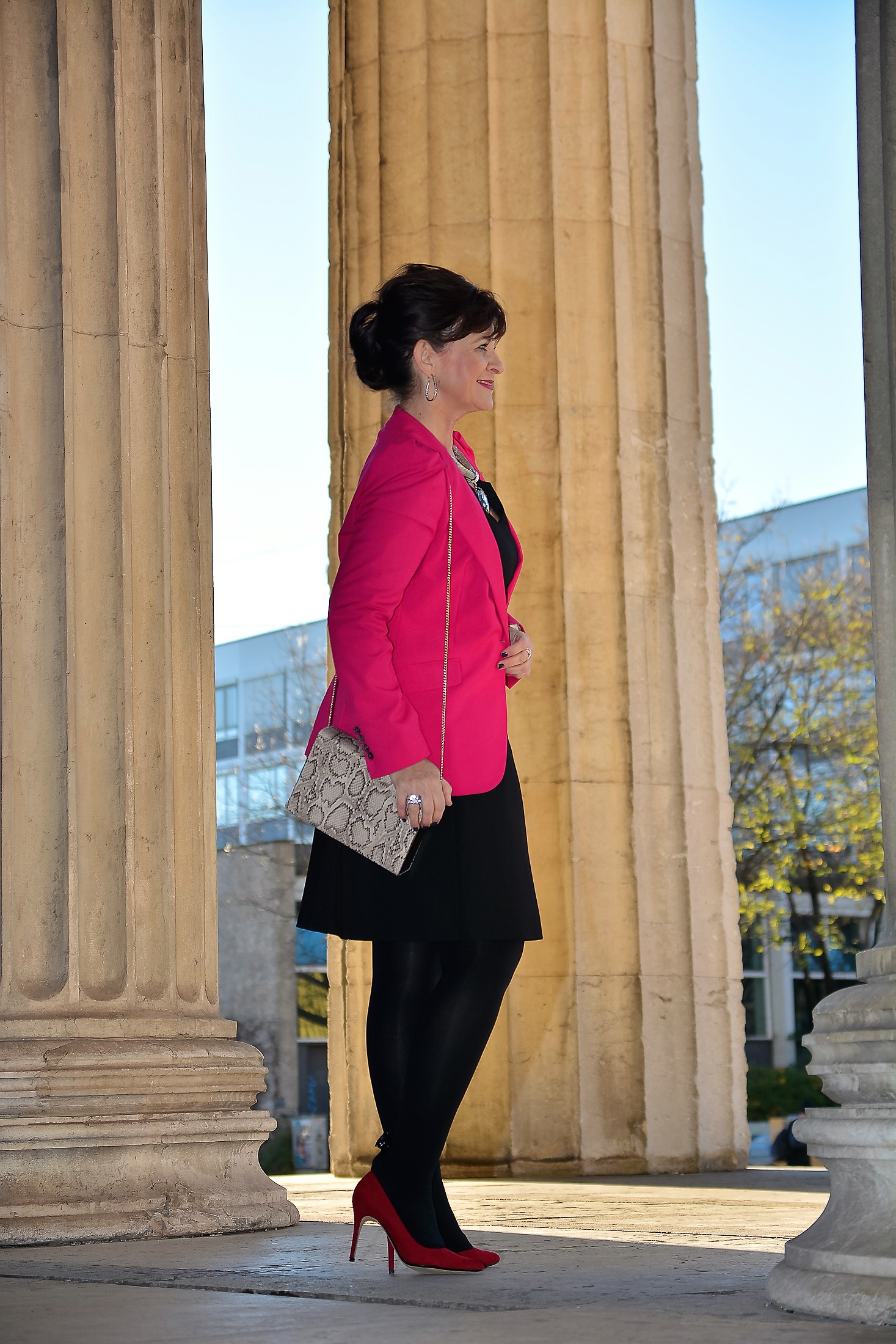 Ein wundervoller, magentaroter Blazer und tolle Accessoires wie Ohrschmuck, Kette, Ringe und Armreifen ergänzen das wunderschöne Kleid – und nicht zuletzt deine schönen Strümpfe und Schuhe!