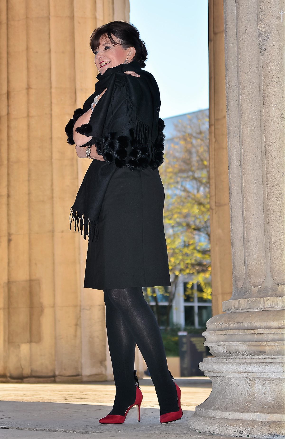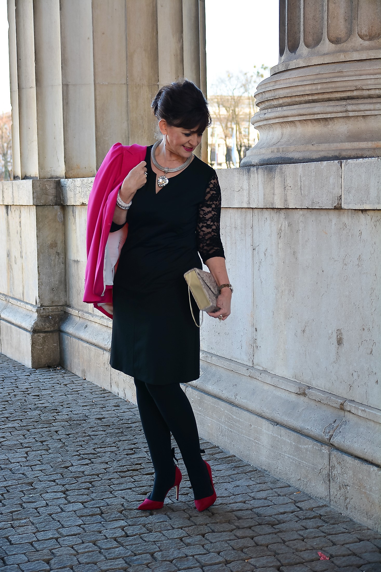 Guten Morgen meine Liebe, wunderschön siehst Du aus – schwarz steht Dir unheimlich gut (wie oft hab ich das schon geschrieben?). Dein Schmuck, Schuhe – perfekt. Aber – ich erlaube mir diesmal a bisi Kritik – (sorry) ich finde, zu einem so schönen festlichen Outfit mit Pumps gehören keine blickdichten Strümpfe….