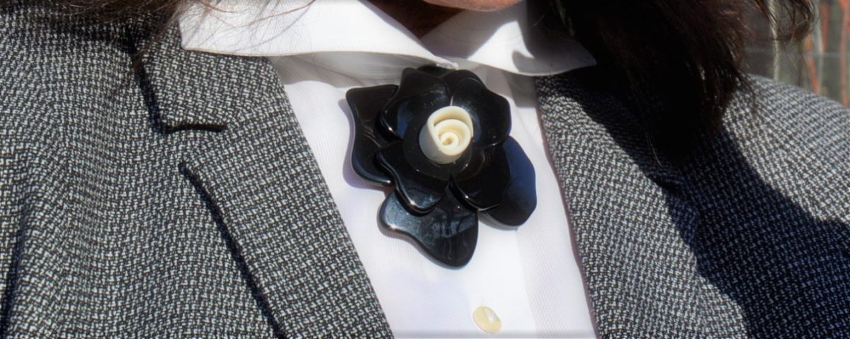 Jede weiße Bluse wird mit der Brosche aufgewertet. Nicht nur zur Bluse tragbar, genauso gut kann sie an einem Cape, einem Pullover oder seitliche am Balzer angebracht werden. Die Kamelien Brosche wird mit einem Magnet befestigt. Also, keine Löcher bei der Befestigung.