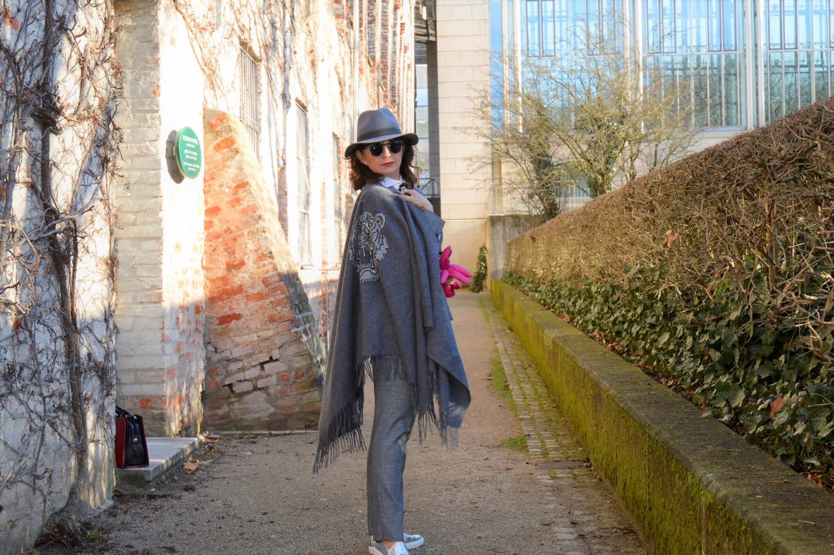 Bei meinem Casual Look habe ich optisch auf Hut, farbiger Tasche, extravaganter Brosche und Schuhen in Szene gesetzt. Anstatt eines Mantel habe ich mich für ein Cape mit Tigermotiv aus Strasssteinen im rückwärtigen Beriech entscheiden. Handschuhe in pink sind ein weiterer Hingucker.