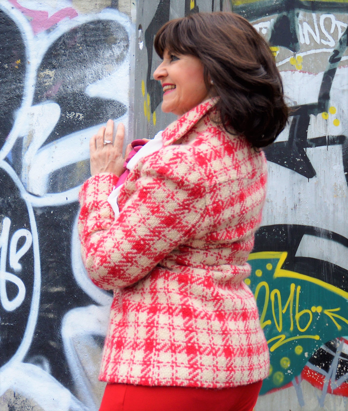 Die Musterung meines Blazers ist im wieder entdeckten Hahnentritt. Die Musterung in ecru und rot ist etwas gewagter, als das bekannte Hahnentritt Muster in schwarz und weiß. Zurückhaltung? Heute eher nicht. Farbe und Akzente sind angesagt. Meine Seidenbluse in gebrochenem Weiß ergänzt sich mit der Musterung im Blazer wunderbar.