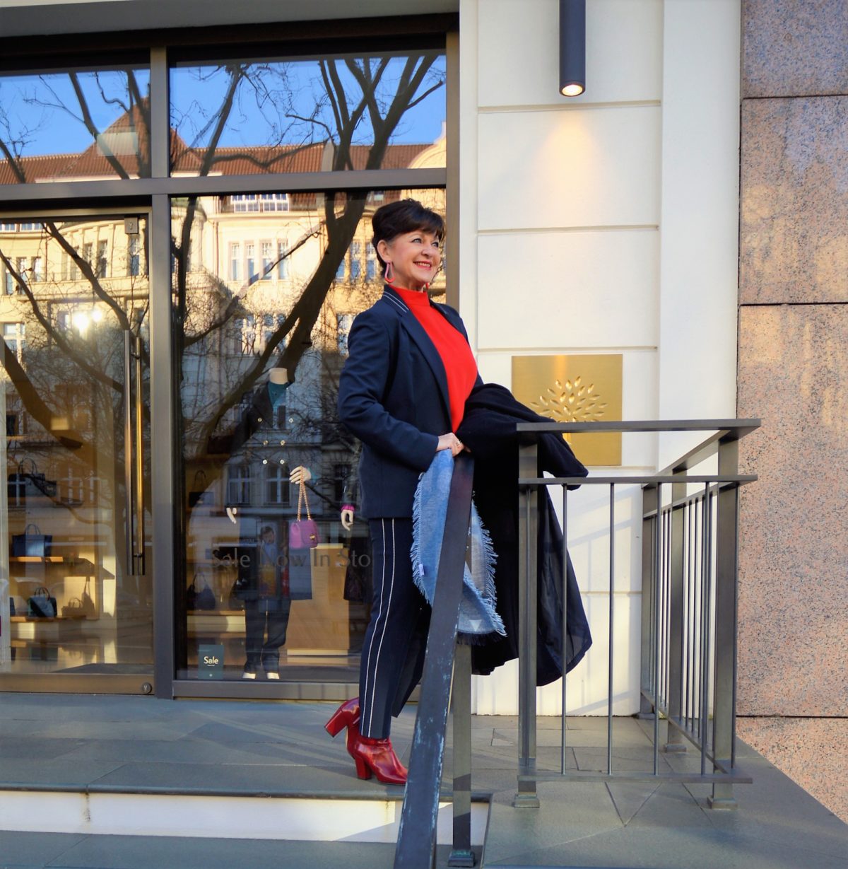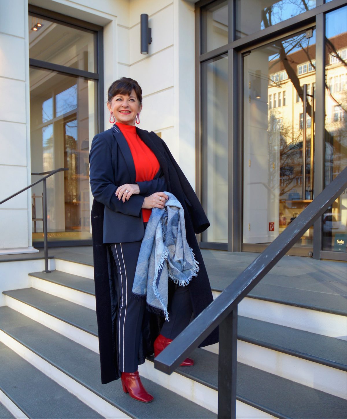 - Als Oberteil habe ich mich für eine rote Bluse entschieden. Sie ist der Eyecatcher bei einem marinefarbigen Hosenanzug.