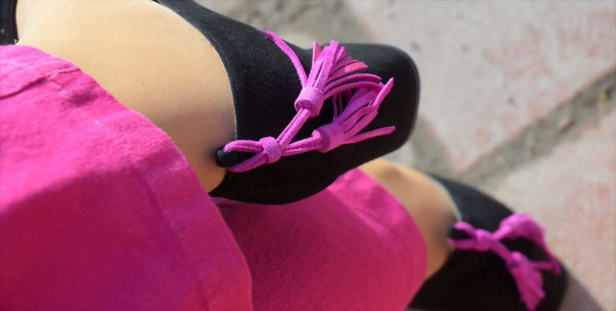 Meine schwarzen Schuhe sind dieses Mal von der Absatzhöhe sehr reduziert, zumindest für meine Verhältnisse. Sie sind mit einer pinkfarbigen Kordel versehen. So bekommt der Schuhe einen ganz individuellen Schick. Meine kleine schwarze Handtasche runden meinen Look perfekt ab.