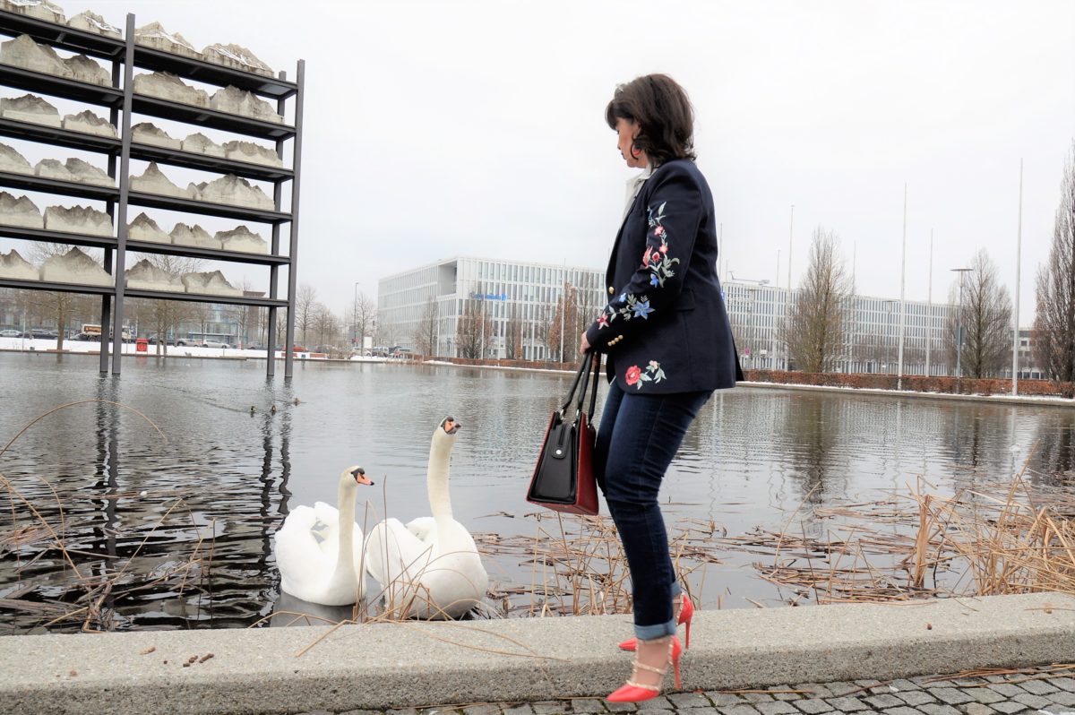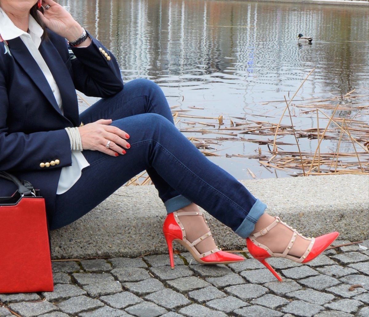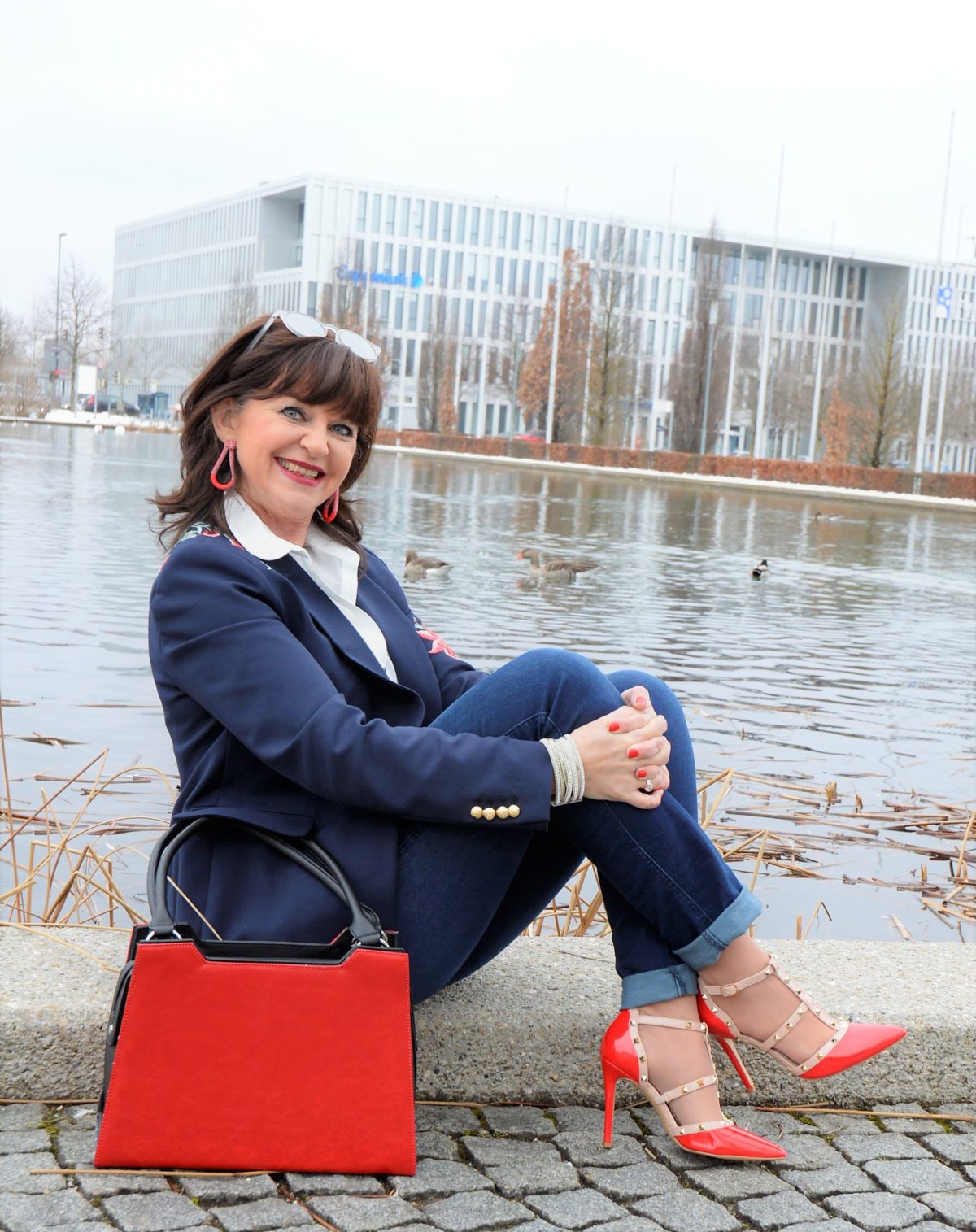 Die passgenaue Jeans, dazu eine weiße Bluse, der schicke Blazer mit floralem Muster und die traumhaft schönen Valentinos mit einer angenehmen roten Farbe – faszinierende, von mir so verehrte Weiblichkeit einer wahren Dame von 50plus!