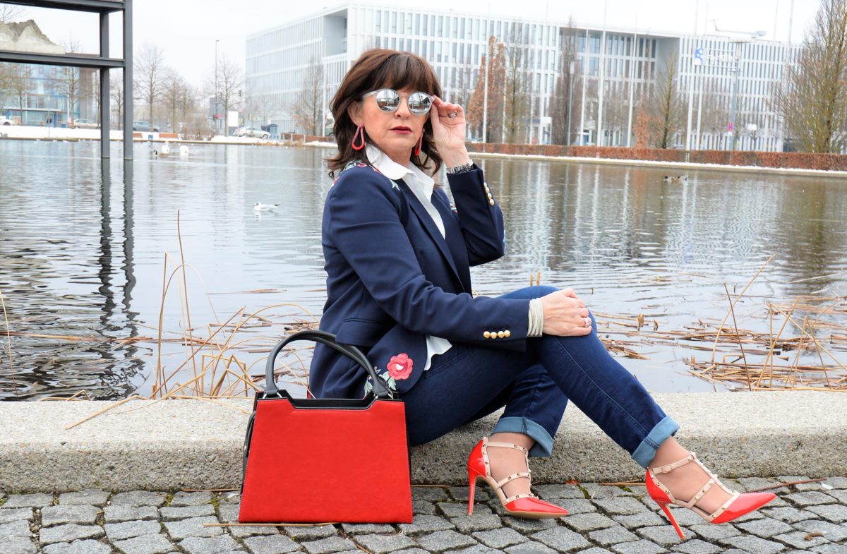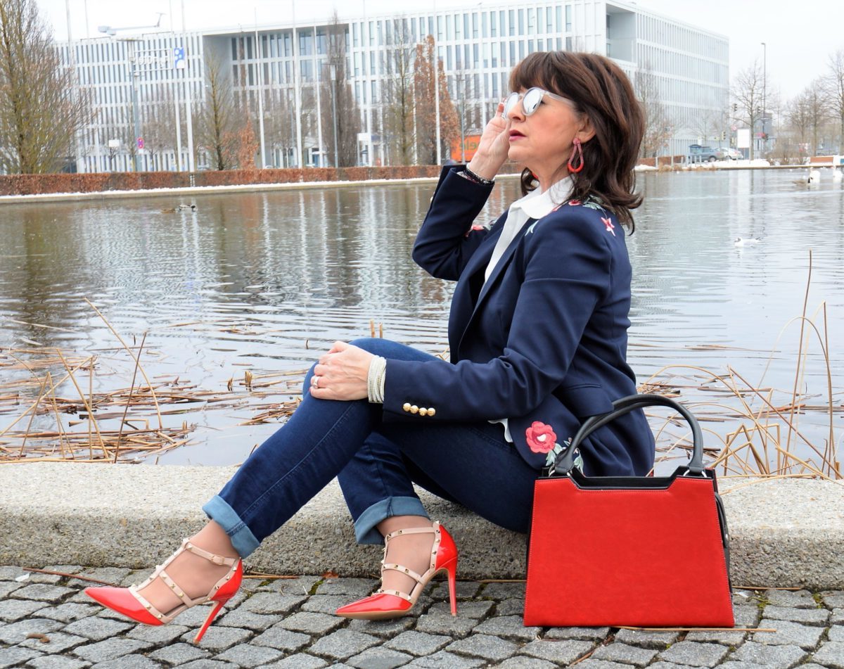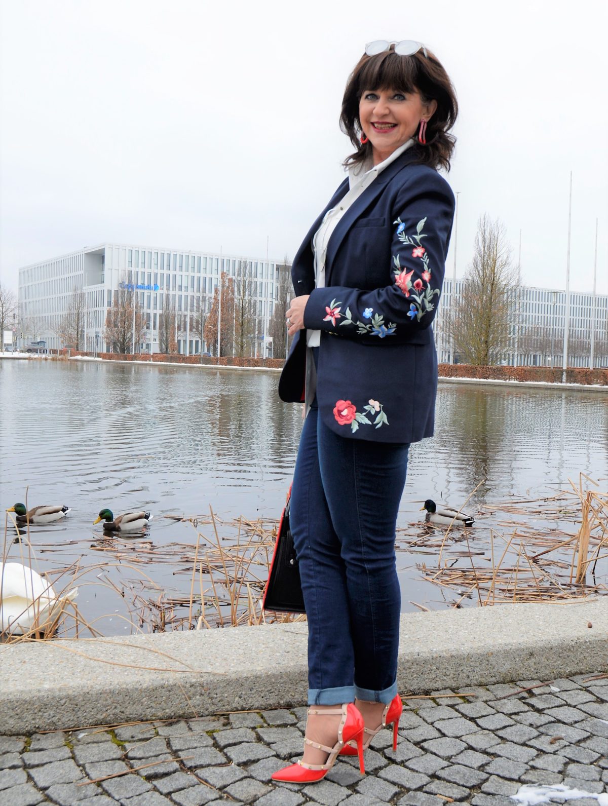 Die passgenaue Jeans, dazu eine weiße Bluse, der schicke Blazer mit floralem Muster und die traumhaft schönen Valentinos mit einer angenehmen roten Farbe – faszinierende, von mir so verehrte Weiblichkeit einer wahren Dame von 50plus!