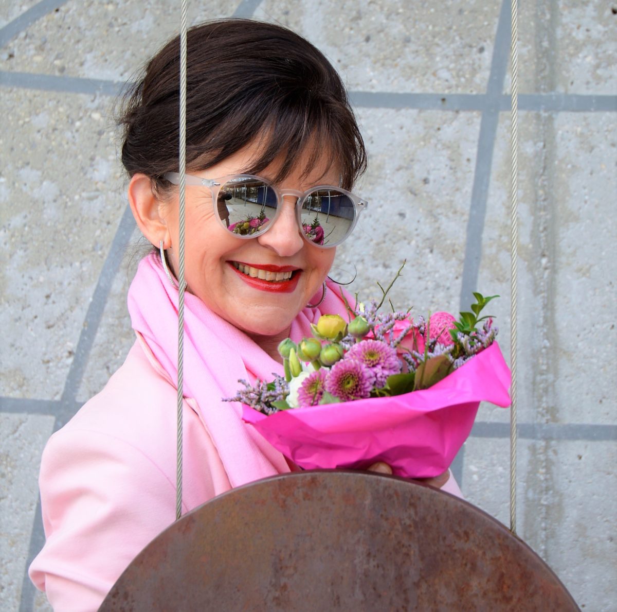 Mein Look macht Lust auf Frühling. Rote Hose kombiniert mit einem rosefarbigen Mantel. Ein kuscheliger Schal muss unbedingt dabei sein. Und ein schöner Blumenstrauß dekoriert jedes Wochenende meine Wohnung.