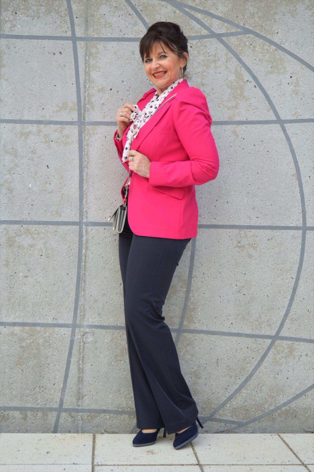 Dress for Success! Bei meinem intensiven Blick in meinen Kleiderschrank ist mir meine dunkelblaue Business Hose wieder aufgefallen. Mit meinem pinkfarbigen Blazer und einer Schluppenbluse wird der Business Look sehr modisch und frisch.