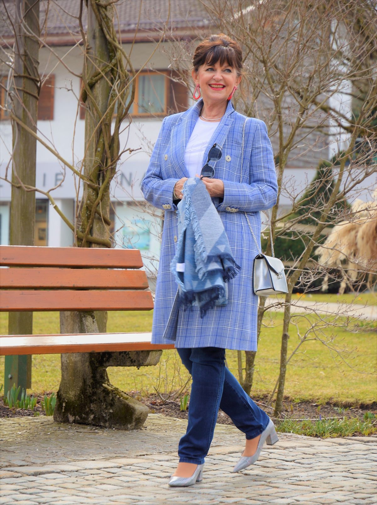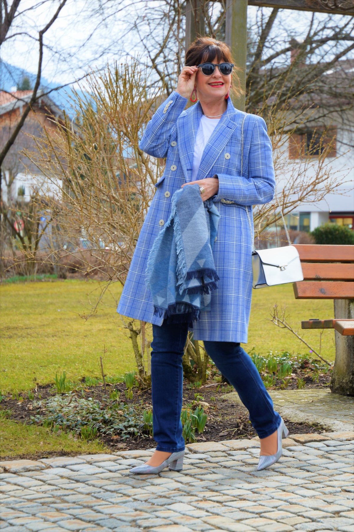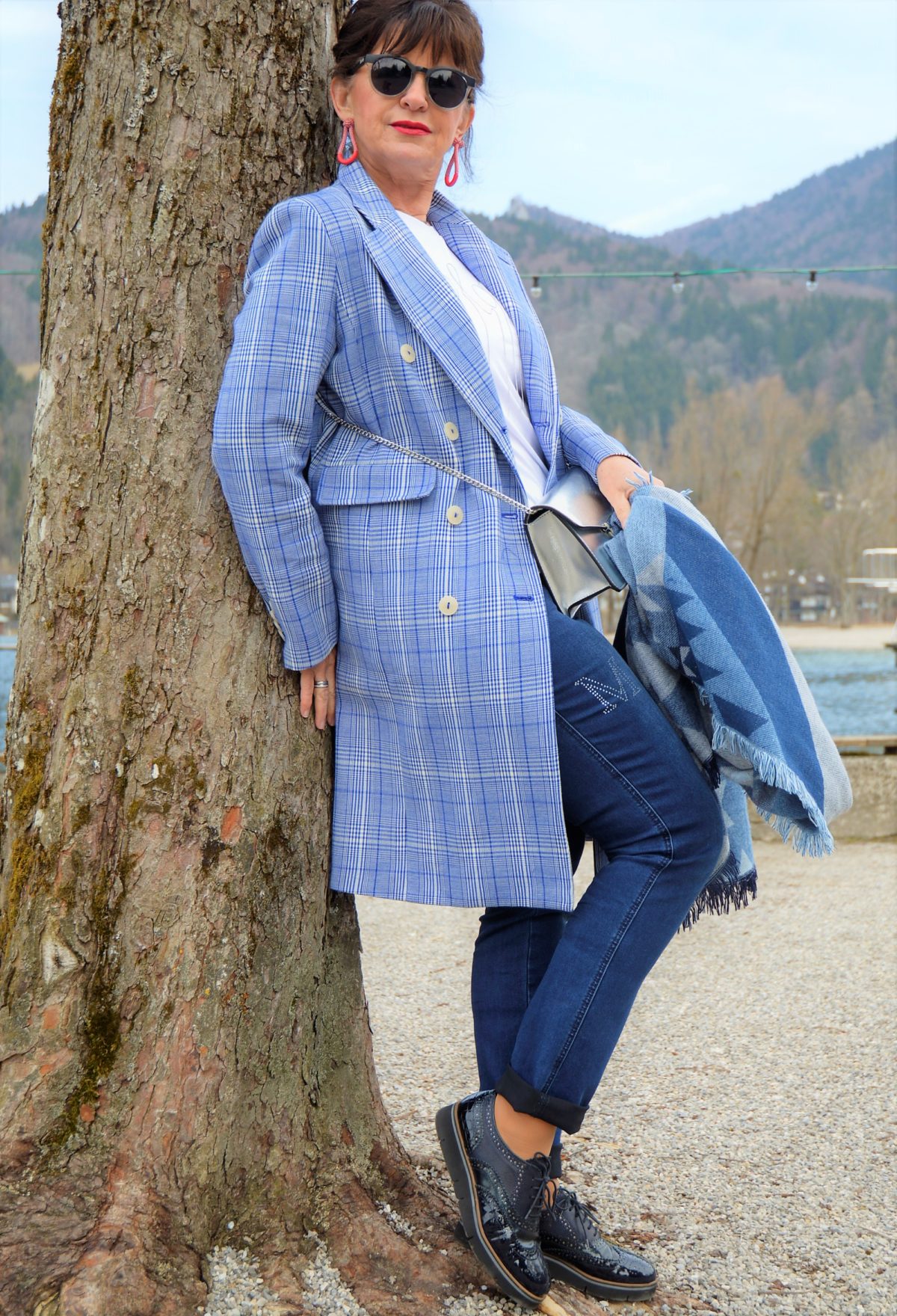 Meine Jeans trägt das Monogramm auf der Vorderseite. Ich kombiniere meinen Liebling mit einem karierten Mantel. Der ideale Casual City Look für viele Gelegenheiten. Durch die verschiedenen Blau-Töne erziele ich einen effektivollen Kontrast.
