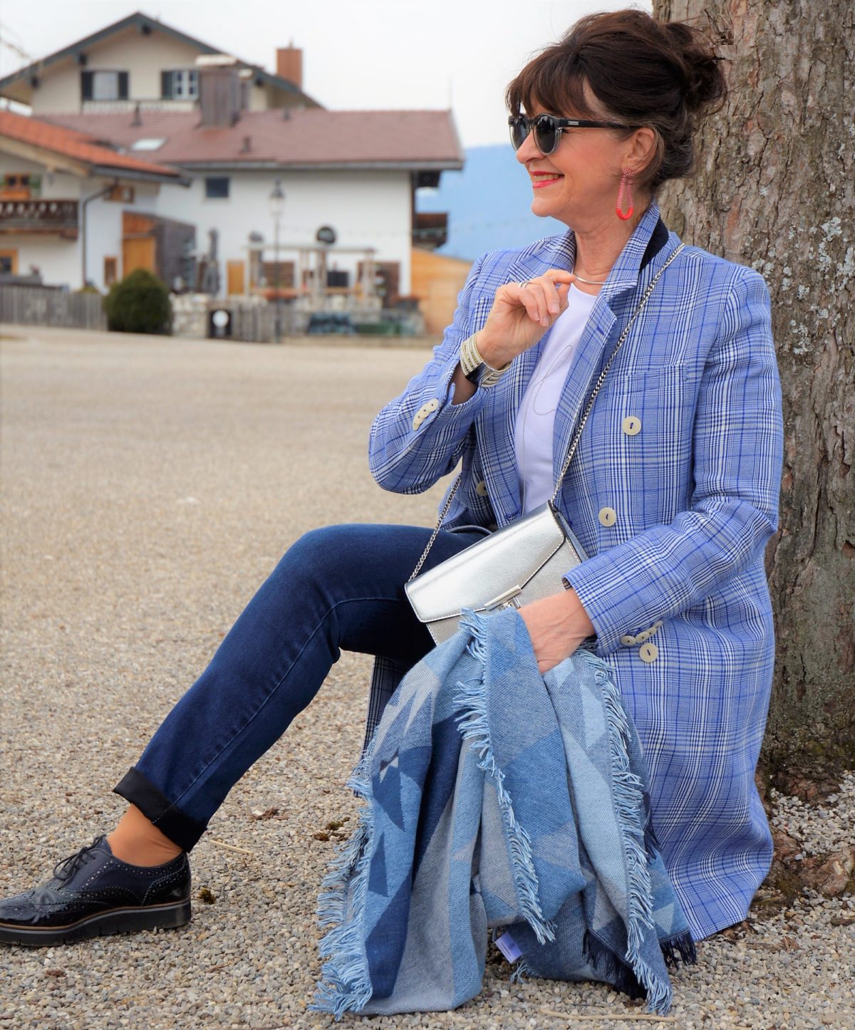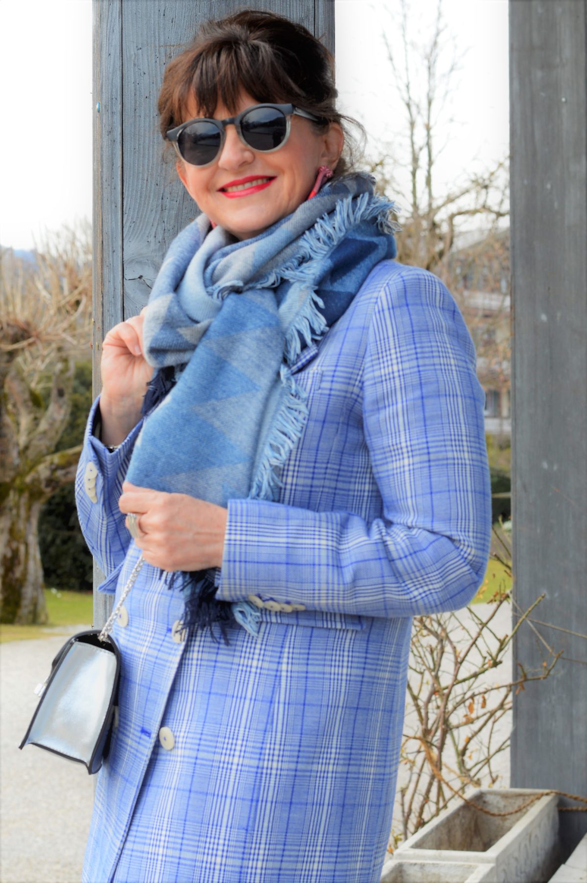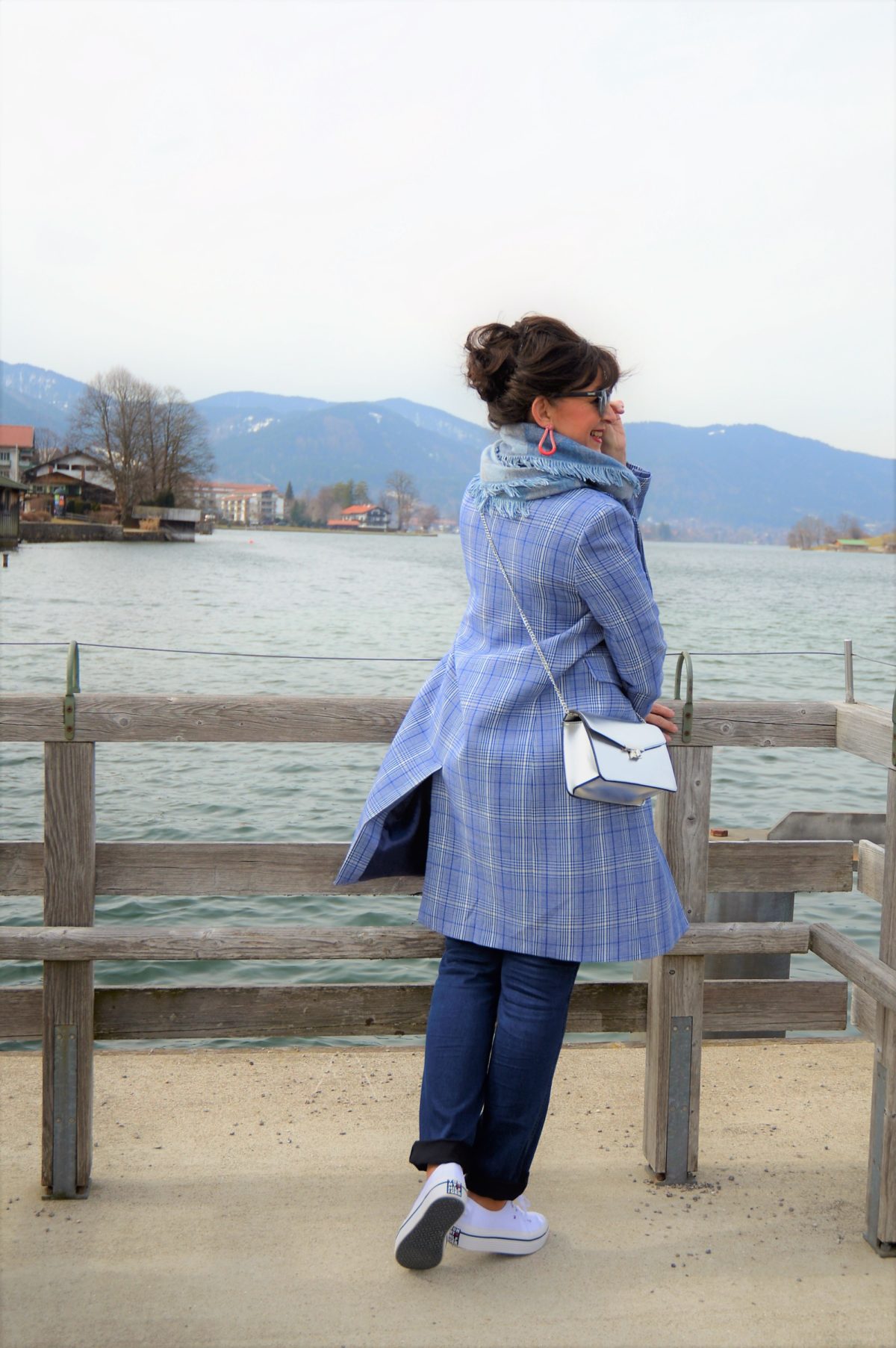 Meine Jeans trägt das Monogramm auf der Vorderseite. Ich kombiniere meinen Liebling mit einem karierten Mantel. Der ideale Casual City Look für viele Gelegenheiten. Durch die verschiedenen Blau-Töne erziele ich einen effektivollen Kontrast.