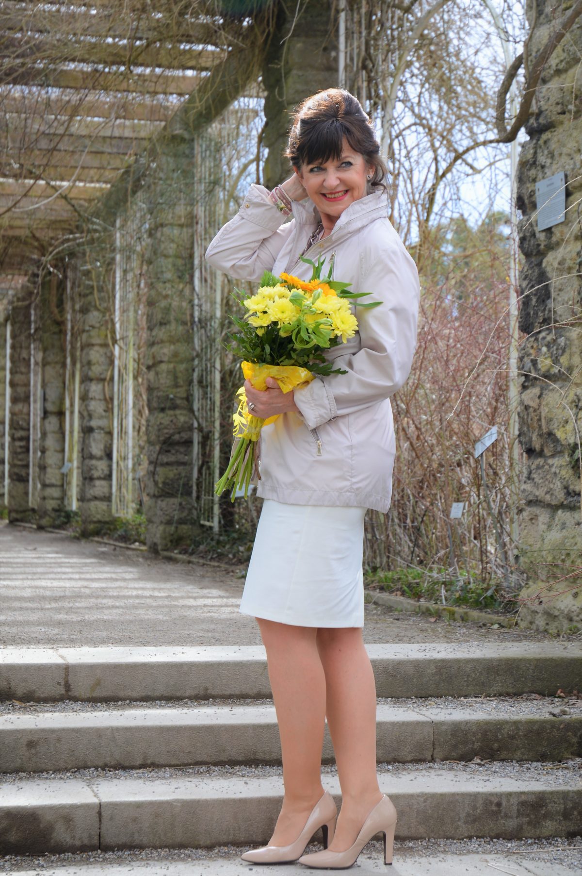 Da am Vormittag noch ein kühles Lüftchen weht, entscheide ich mich bei meinem Look für eine leichte Übergangsjacke aus Fliegerseide. Sie ist ideal für Reisen, Freizeit und ein Allrounder für meinen alltäglichen Vorhaben. Über einen Hosenanzug, zum Business Look oder zur beliebten Jeans begleitet mich die Jacke schon häufiger. Die Taillenbetonung erziele ich mit dem Tunnelzug, der in der Jacke integriert ist.