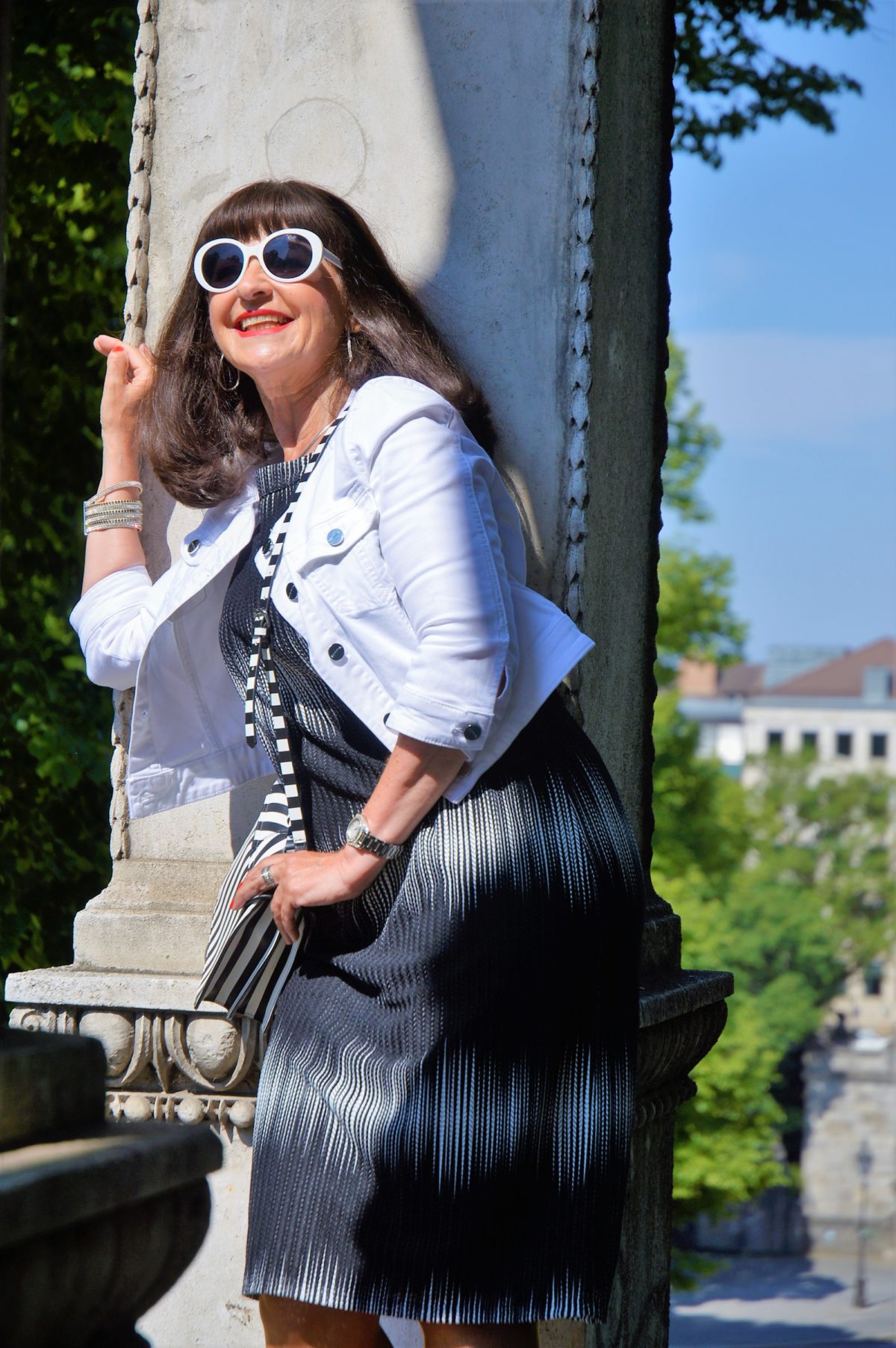 Für den schicken Business Look trage ich mein Kleid mit den dekorativen Farbverläufen mit einer weißen Jeansjacke. Das Kleid ist locker leicht geschnitten und ist zur warmen Sommerzeit ein Blickfang. Die black fringed Stripes sind extravagant und wirken bei jeder Bewegung immer wieder anders. Die Anordnung der Längsbetonung lässt die Figur optisch schlanker erscheinen.