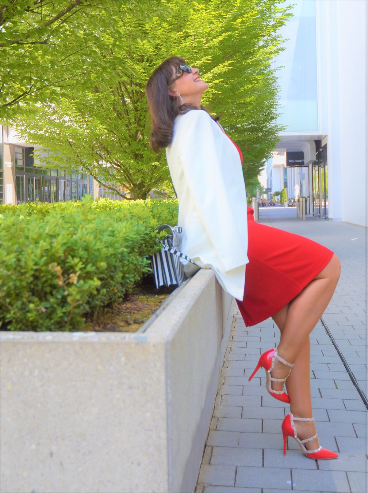 Mein rotes Etuikleid ist ein absoluter Hingucker. Aber ein Kleid sollte nicht nur alleine getragen werden. Mit meinem Longblazer in weiß unterstreichen wir eine elegante und klassische Stilrichtung. Egal, ob es ein weißer, dunkelblauer oder schwarzer Blazer ist. In sommerlichen Zeiten ist ein weißer Blazer die perfekte Ergänzung für unterschiedliche Anlässe. Hast Du einen weißen Blazer in Deinem Kleiderschrank?