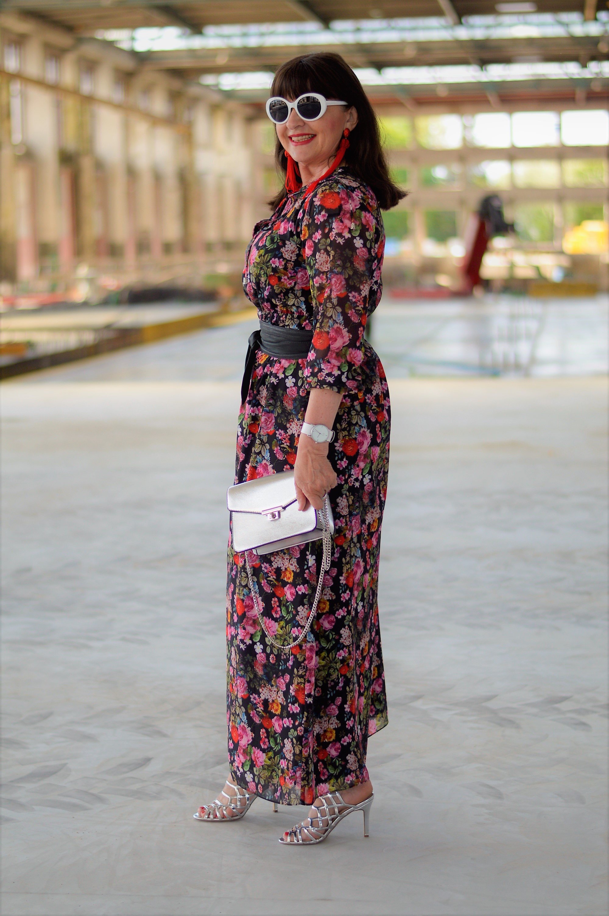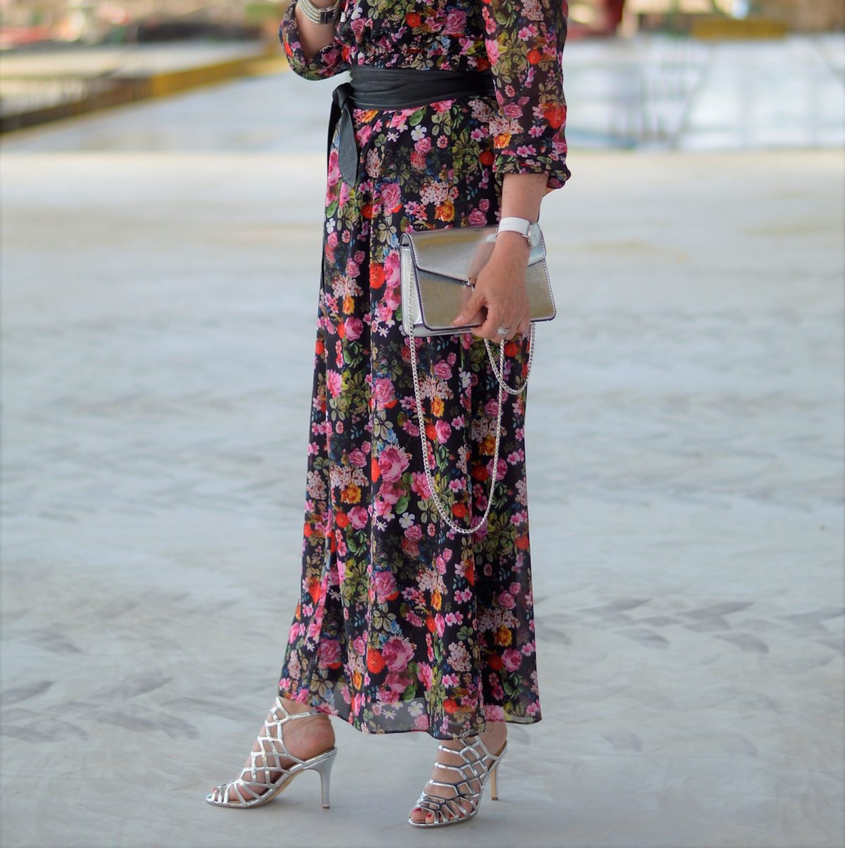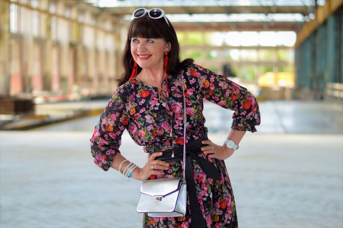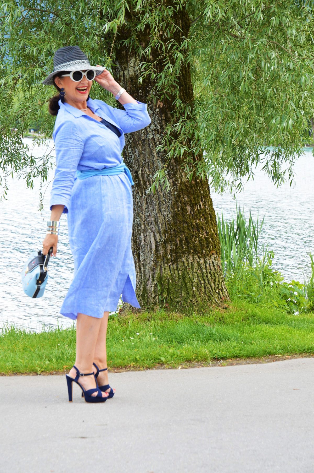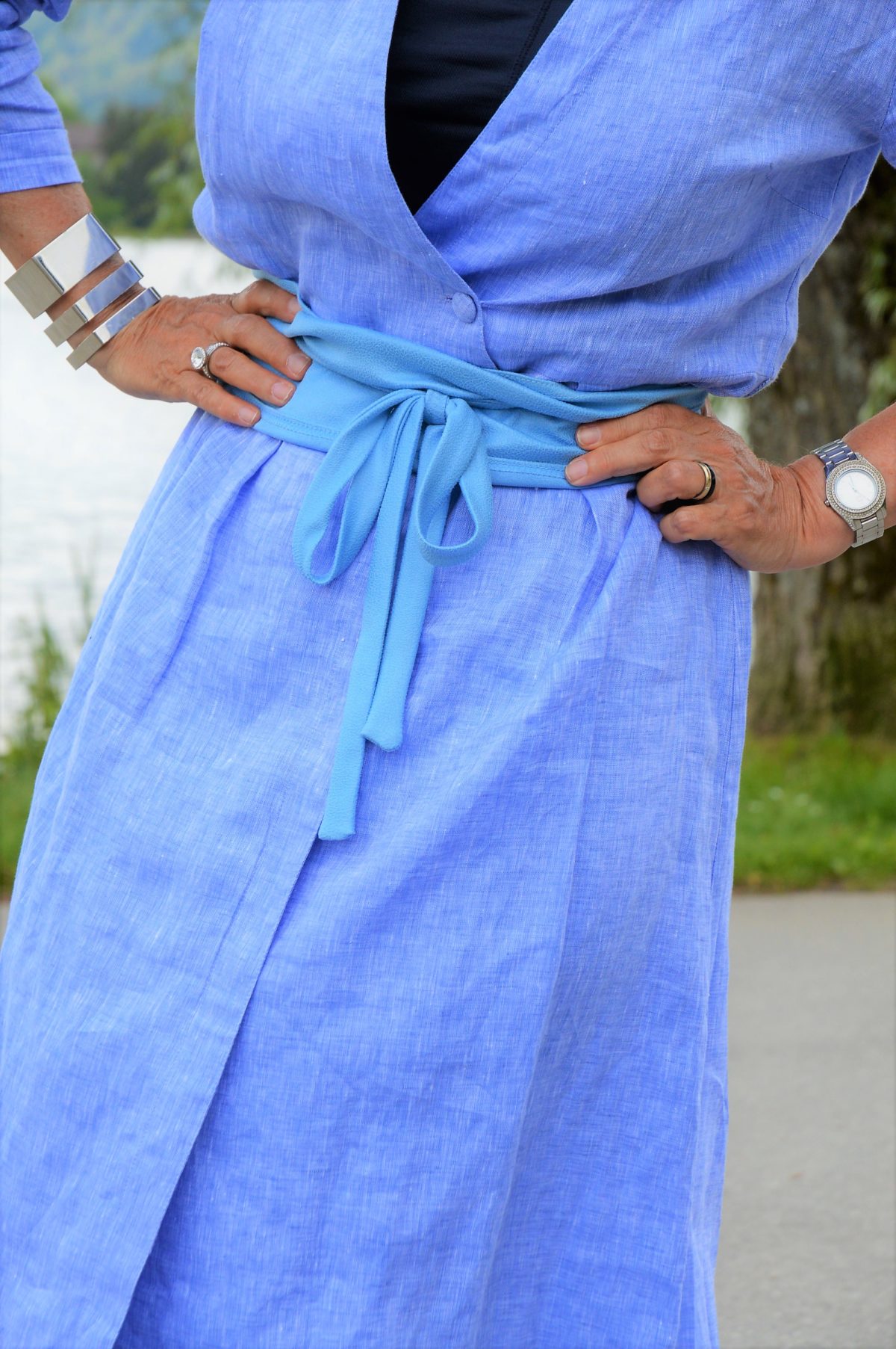 Der ursprünglich geplante Look ist das Kleid mit dem schicken Gürtel und den hohen offenen Schuhen. Für eine Sommerparty am See oder als schicker City Look ist es für mich Leichtigkeit pur. Als Accessoire habe ich eine silberfarbige Beuteltasche gewählt. Da hat alles Platz, was ich den ganzen Tag so benötige.