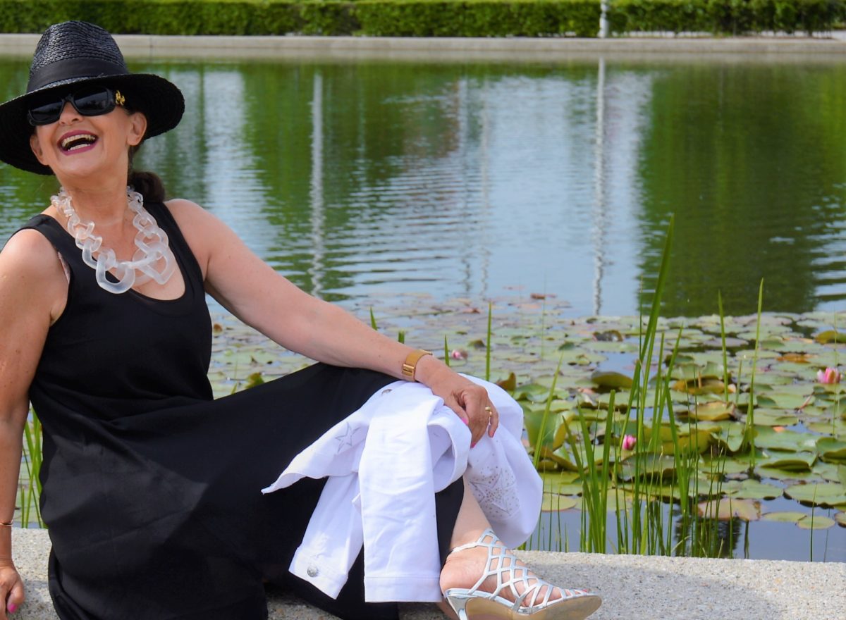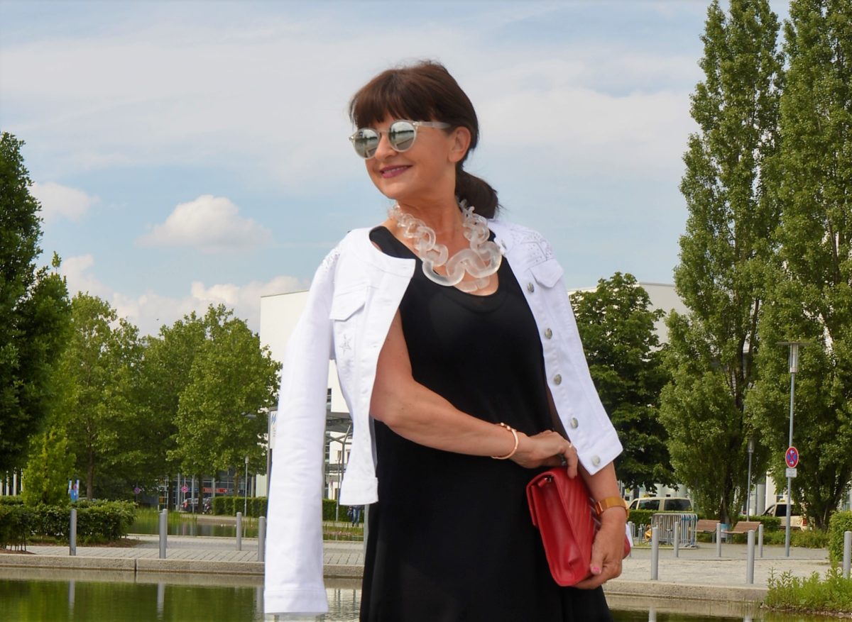 Das Wetter soll heute sommerliche Temperaturen erreichen. Prima! Ein locker geschnittenes Kleid bringt mich beschwingt durch den Tag, egal wie heiß es werden sollte. Schwarz geht für mich zu allen Jahreszeiten. Der monochrome Look wird durch eine weiße Jeansjacke aufgelockert. Falls es etwas kühler werden sollte, schlüpfe ich in die Jacke und das kühle Lüftchen hat keine Chance.