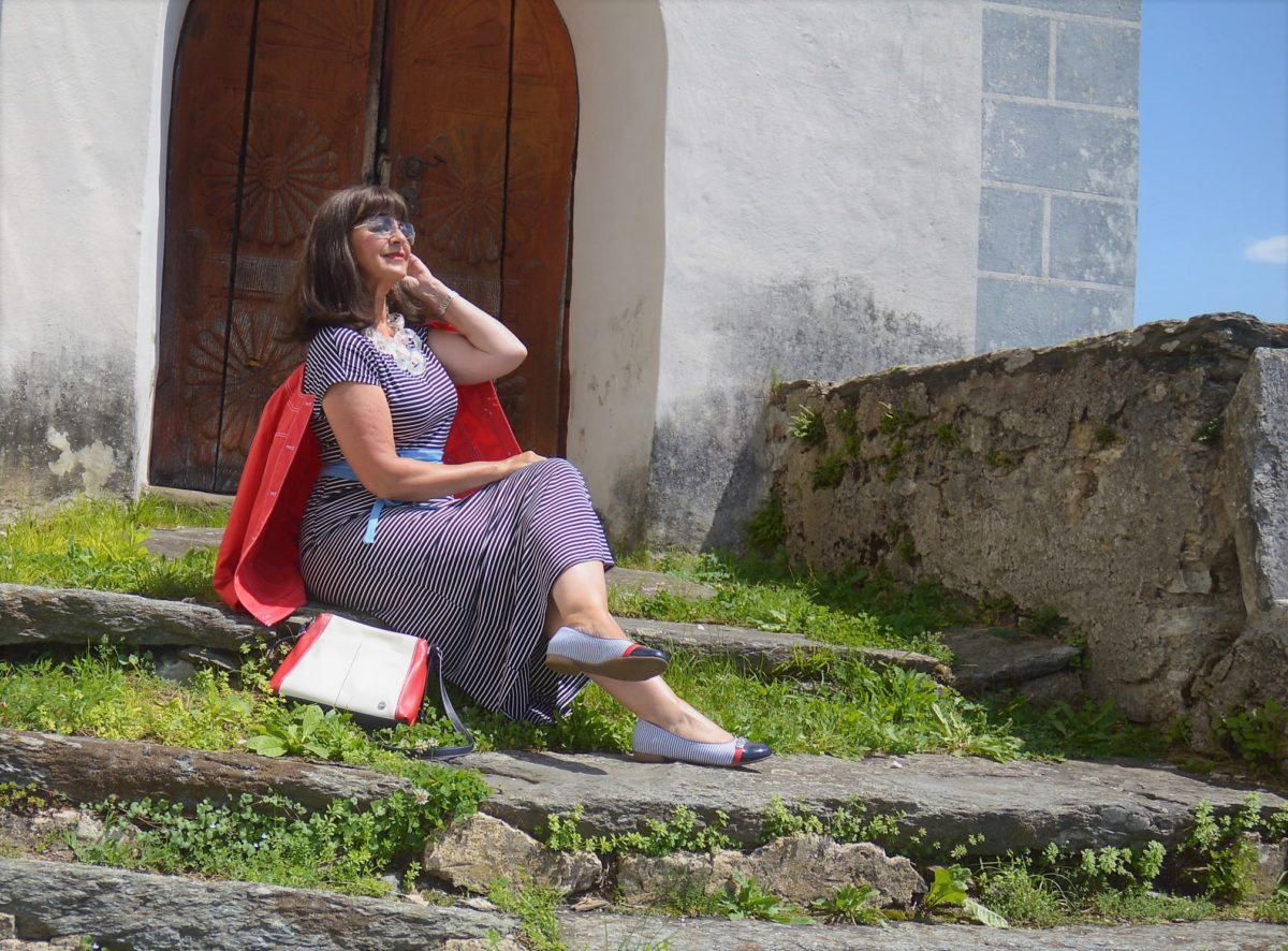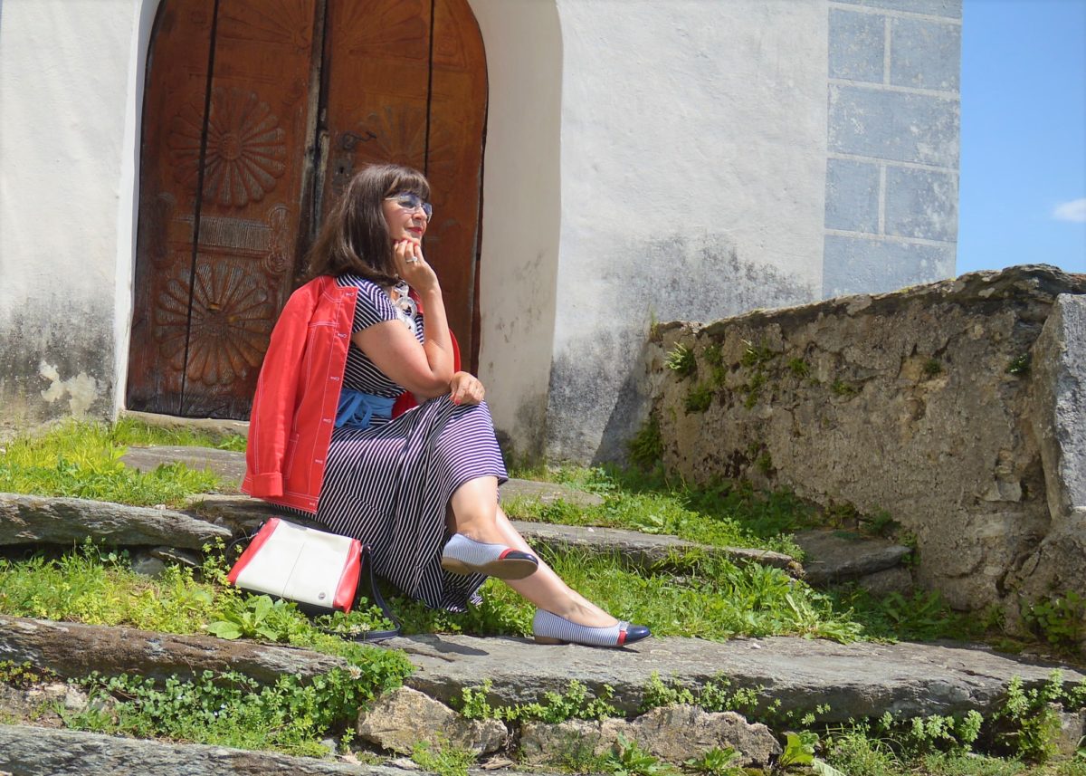 Rot hebt die Stimmung. Deshalb trage ich zum Maxikleid mit Streifen sehr gerne meinen roten Kurzblazer. Falls im Kleiderschrank kein roter Blazer vorhanden ist, findest Du bestimmt einen weißen Blazer oder eine weiße Jeansjacke.