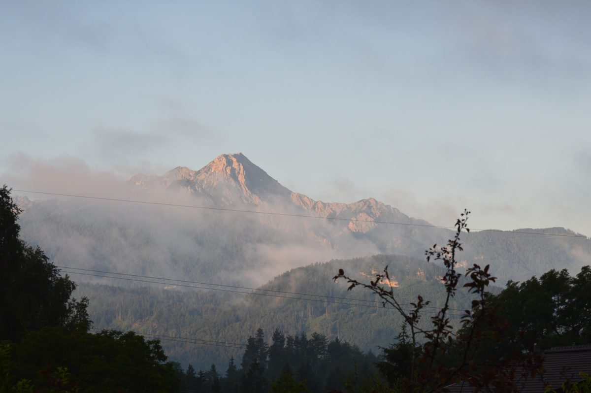 Wie schön ist das denn? Am frühen Morgen, so gegen 7.30 Uhr, kommt die gute Fee des Hauses, Renate, auf’s Zimmer und beglückt mich mit einer Tasse heißen Tee. Ich liege noch im Bett und erfreue mich über den tollen Gipfelausblick. Es geht schon los, das mit der Entspannung. Im Bett liegen und die erste Tasse Tee trinken – einfach nur schön.