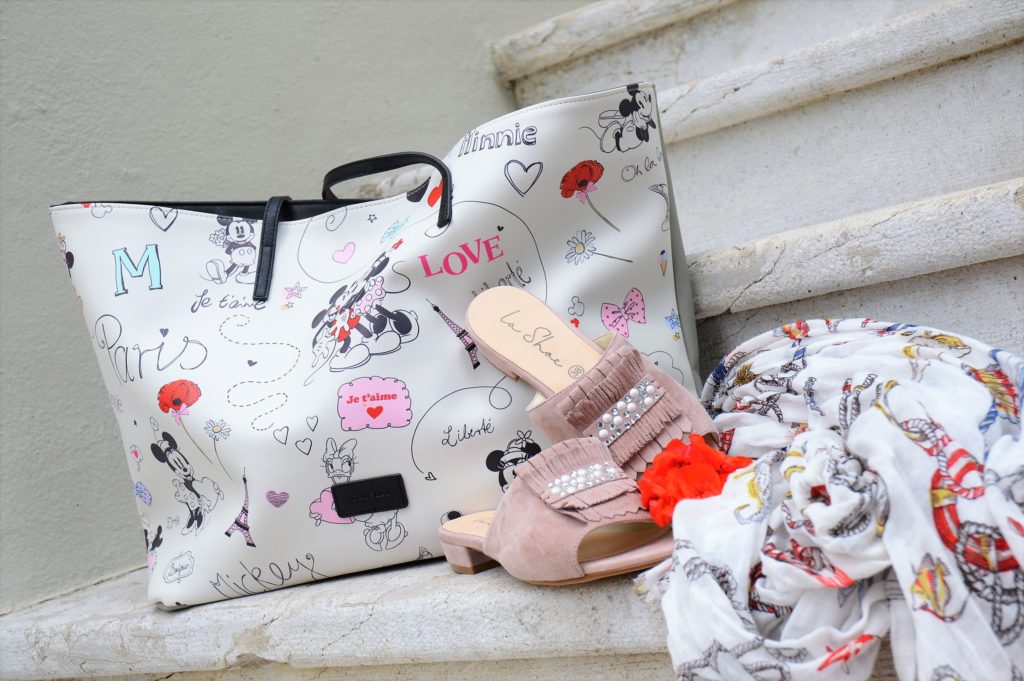 Für den Freizeitlook nehme ich gerne einen flotten Shopper mit. Meine große Tasche ist von Codello und mit den Mickey Mouse Motiven ist es ein schöner Blickfang. Darin passt auf jeden Fall mein Sommerschal, der ebenfalls von meiner liebsten Schalfirma Codello ist.