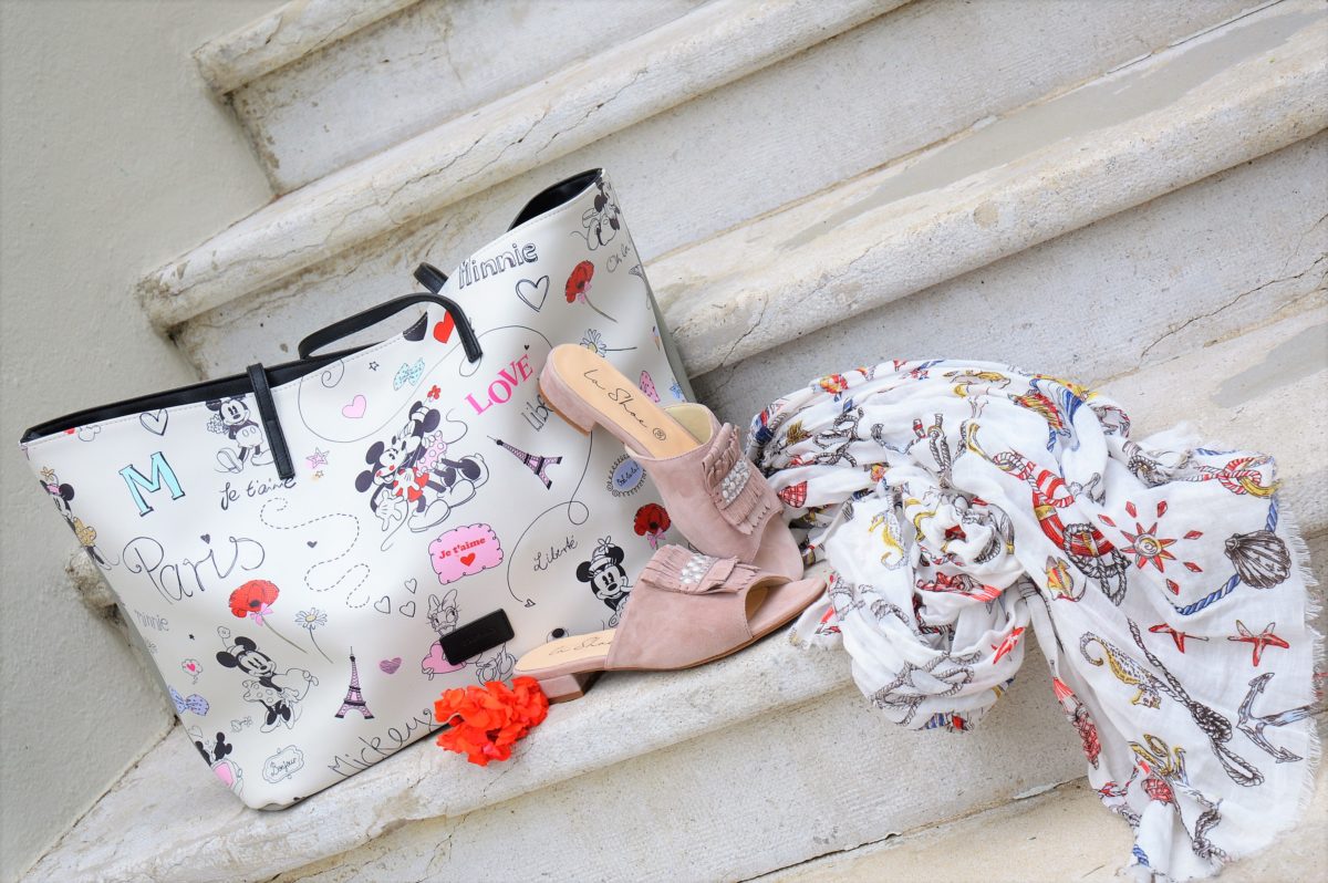 Für den Freizeitlook nehme ich gerne einen flotten Shopper mit. Meine große Tasche ist von Codello und mit den Mickey Mouse Motiven ist es ein schöner Blickfang. Darin passt auf jeden Fall mein Sommerschal, der ebenfalls von meiner liebsten Schalfirma Codello ist.