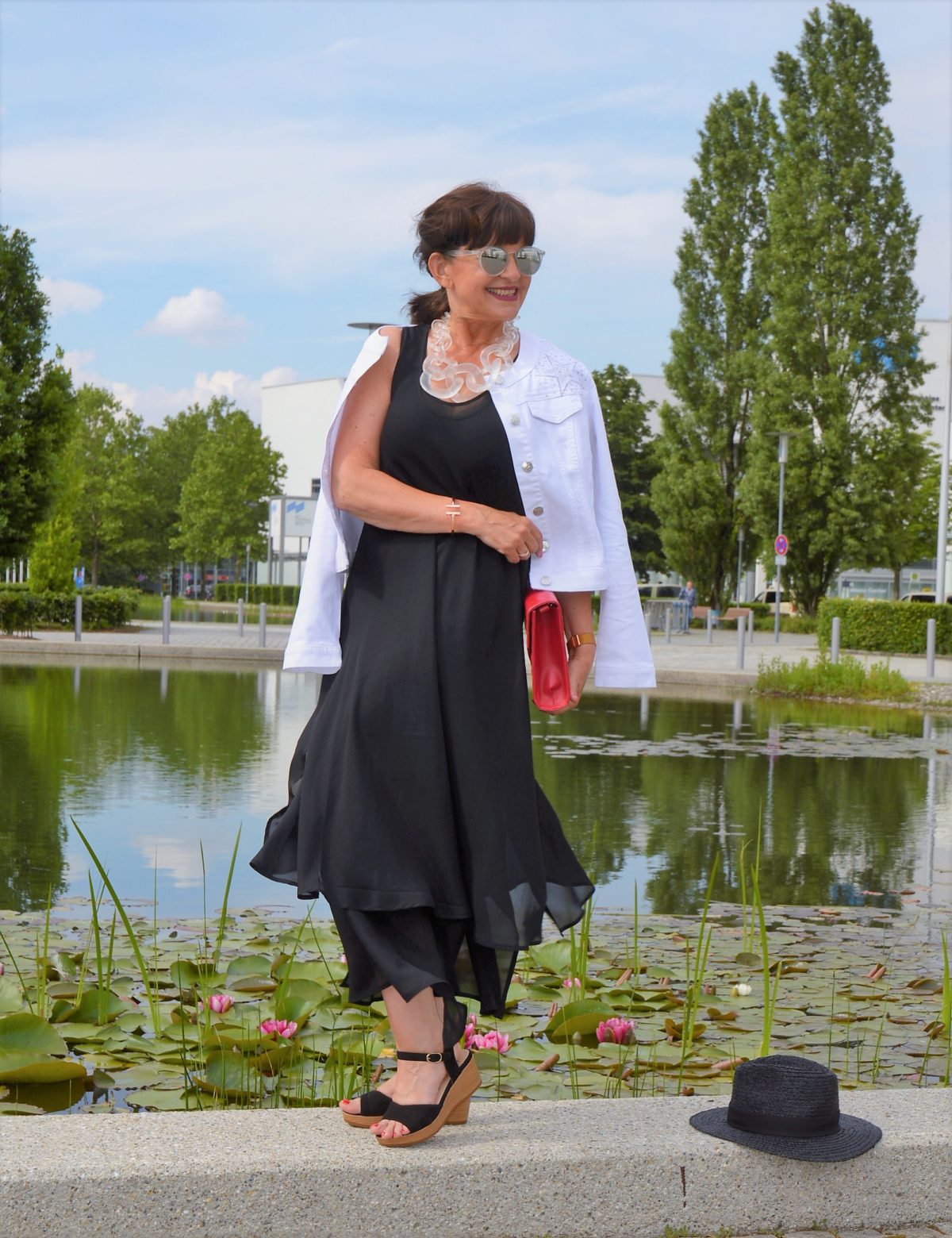 Da ich ein absoluter Black & White-Fan bin, greife ich zur weißen Jeansjacke und kombiniere diese mit meinem Kleid. Natürlich kannst Du auch die „ganz normale Jeansjacke“ dazu tragen. Es ist mir von der Aussage nicht stilvoll genug, den Allrounder blaue Denimjacke zum kleinen Schwarzen zu kombinieren.
