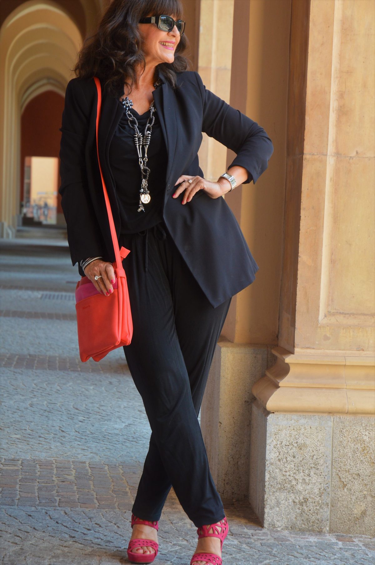 Zum Ausgehlook trage ich einen langen schwarzen Blazer zum Overall. Die pinkfarbigen Schuhe sind der absolute Eyecatcher, die dürfen am Abend auf keinen Fall fehlen. Ob Theater, Party oder Geburtstagsfest – schneller kann gutes Aussehen gar nicht gehen. Reinschlüpfen und fertig!