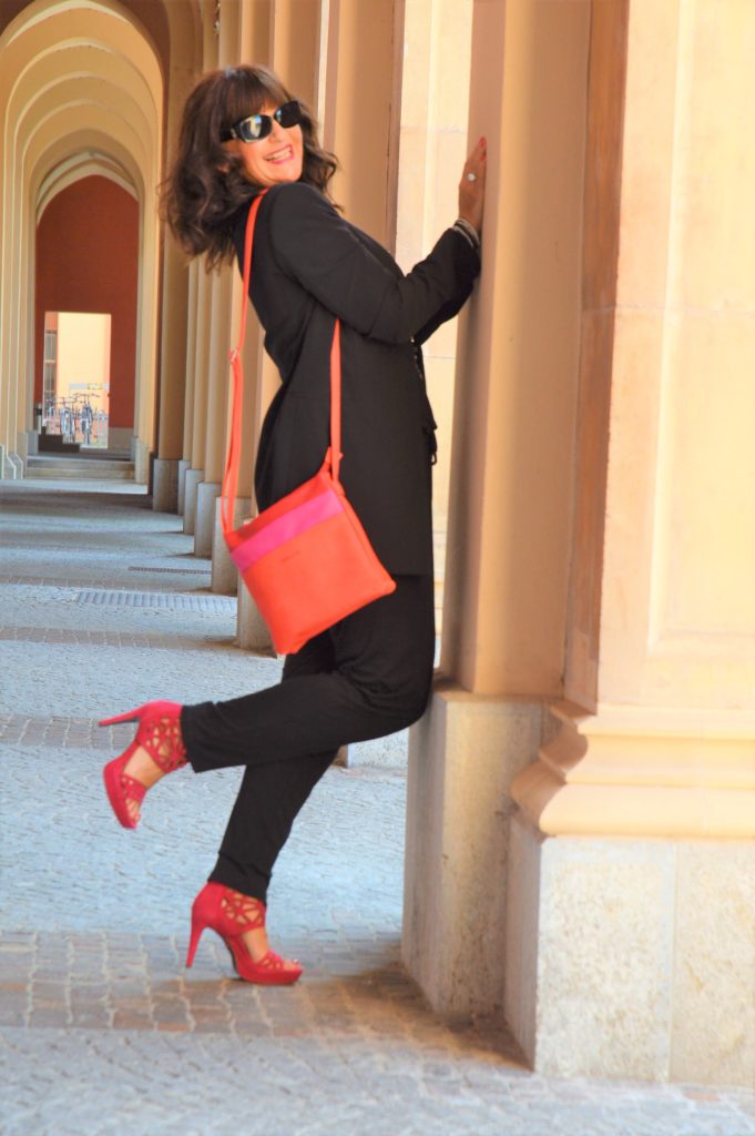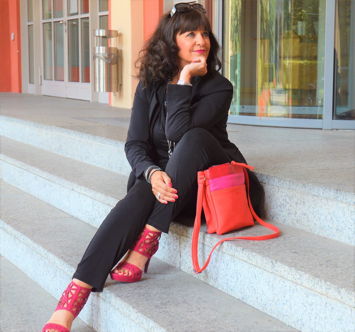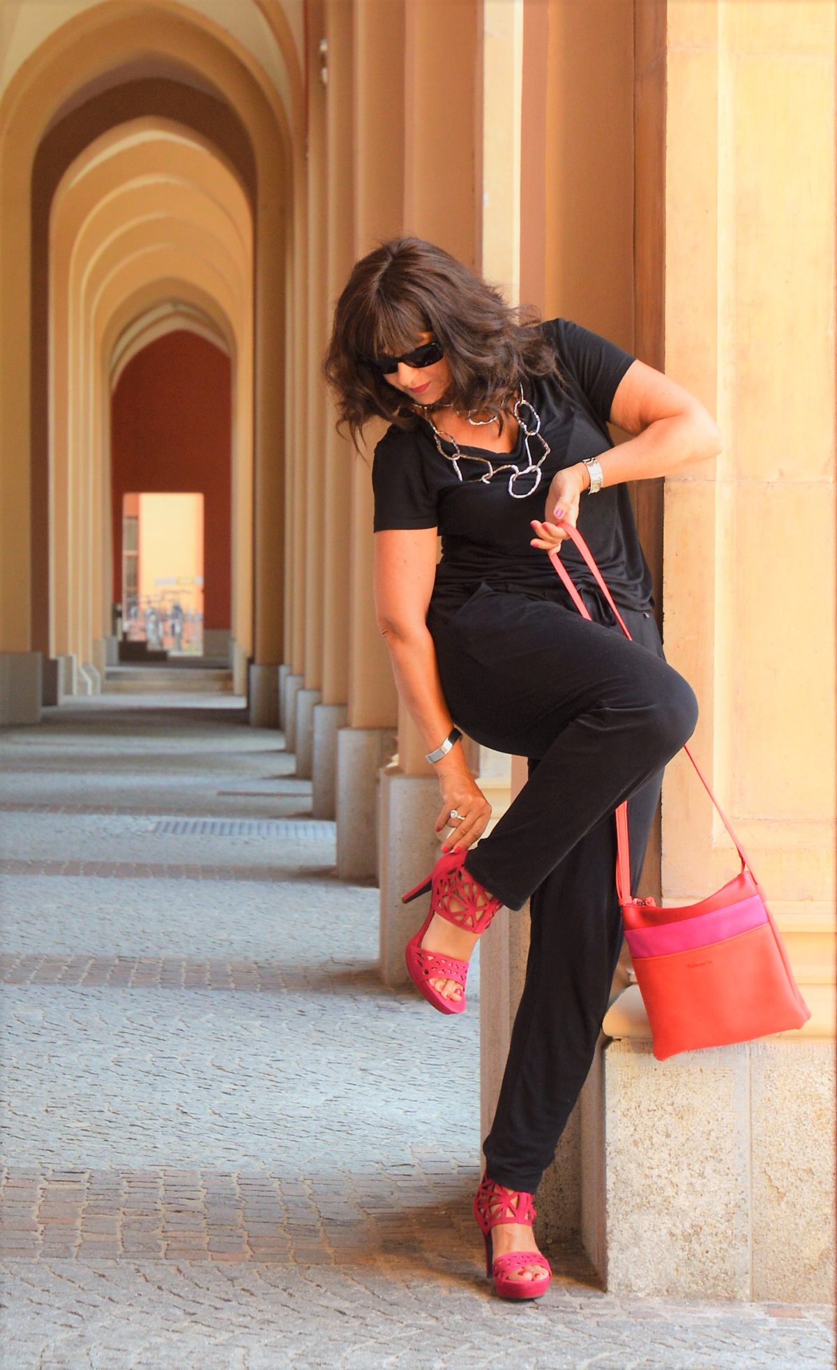 Durch die besondere Schnittführung wirkt mein schwarzer Overall auch solo schick. Bei diesem Look rücken die außergewöhnlichen Highheels und die passende Tasche in den Mittelpunkt. Pinkfarbige Schuhe sind die perfekte Ergänzung zu schwarz. Die Tasche lässt sich cross-over oder einfach über die Schulter tragen.