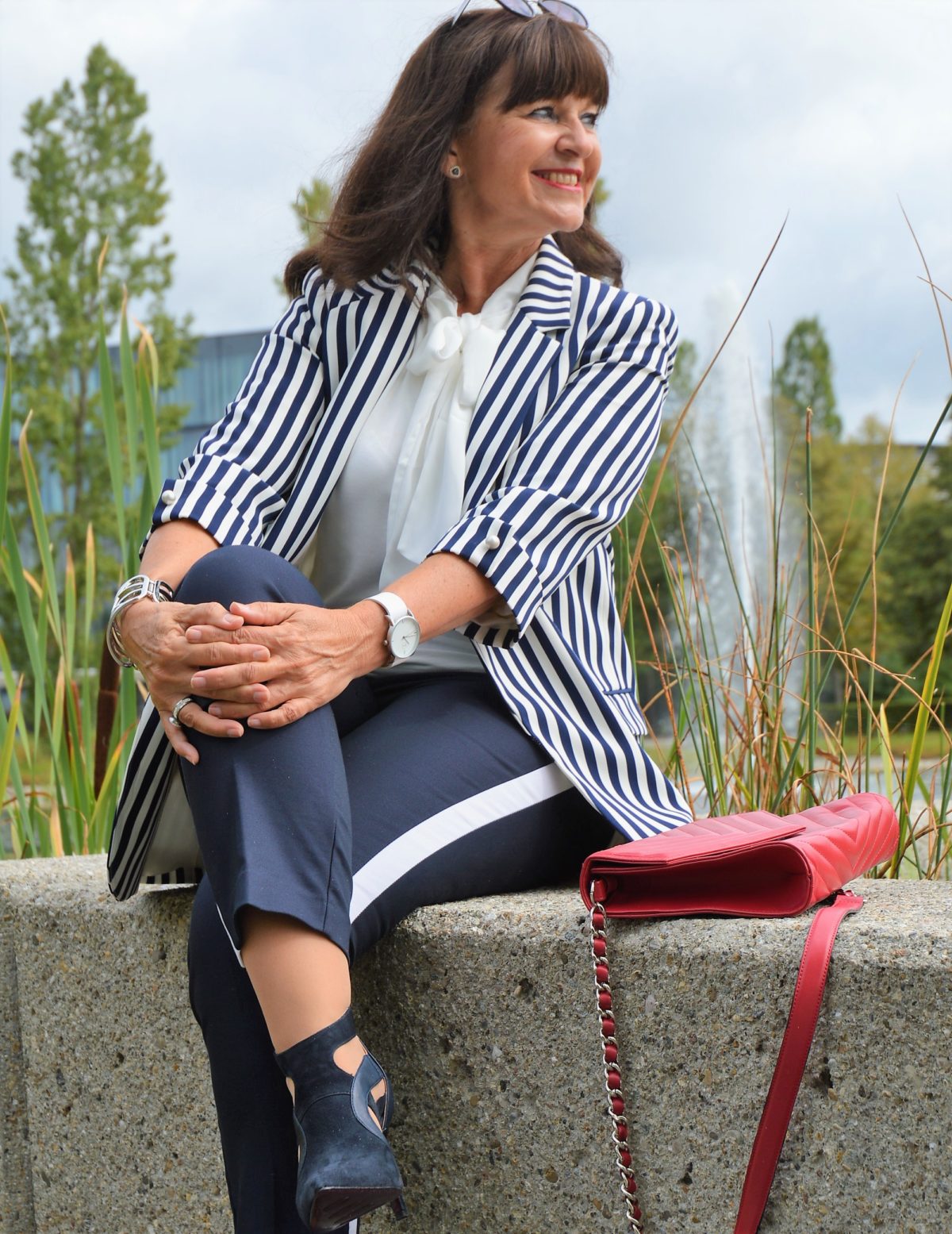 Mein Outfit für diesen Tag ist eine dunkelblaue Hose mit angesagten Galon Streifen. Ich kombiniere die Hose mit einem gestreiften Blazer. Als Unterteil wähle ich eine weiße Seidenbluse mit Schluppe. Ich liebe diese Art von Blusen.