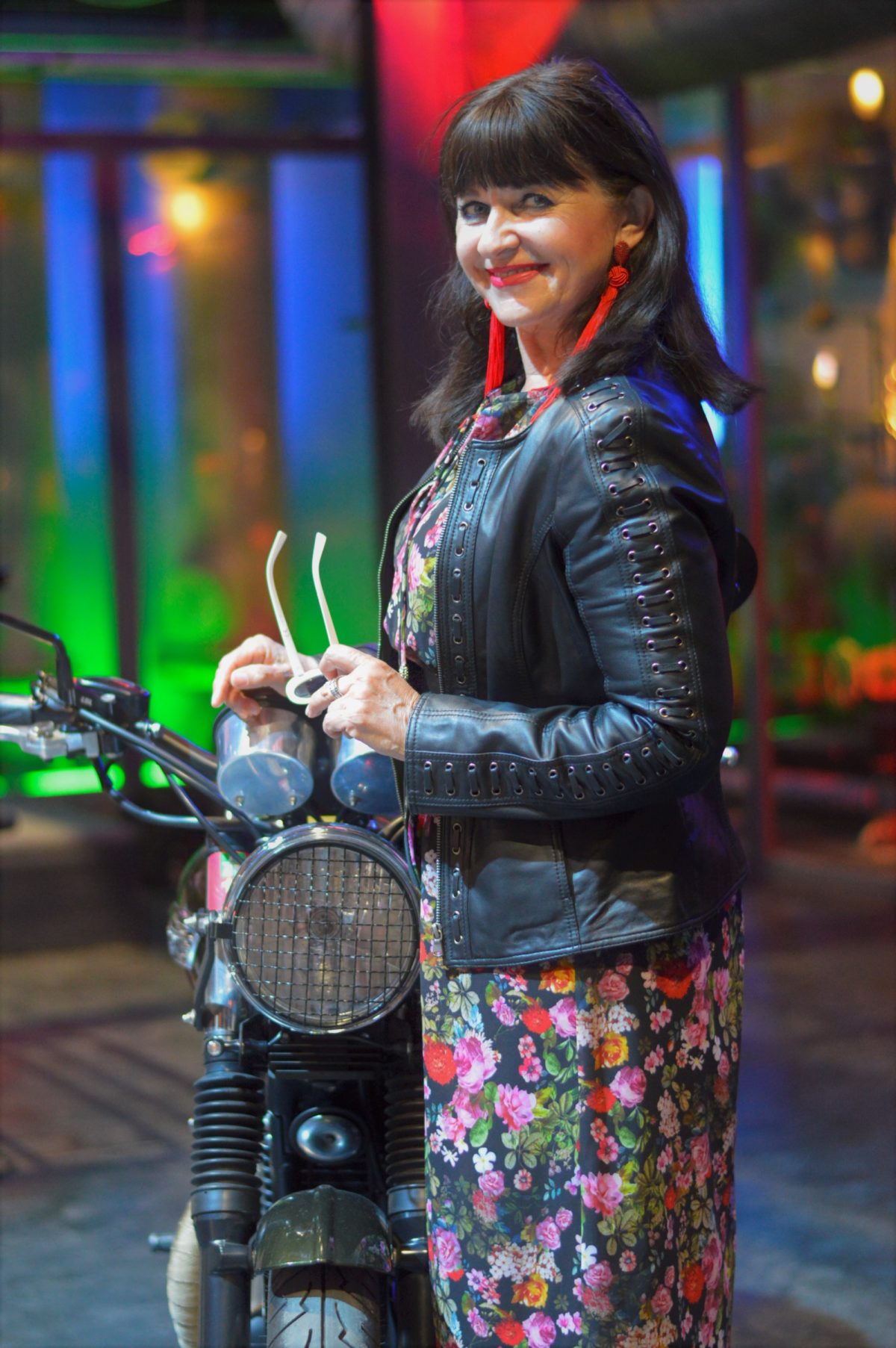 Mit einem farbenfrohen Maxikleid und einer passenden schwarzen Lederjacke starte ich in die Woche. Bei dem Wetter können durchaus schon Stiefeletten zum Maxikleid kombiniert werden.