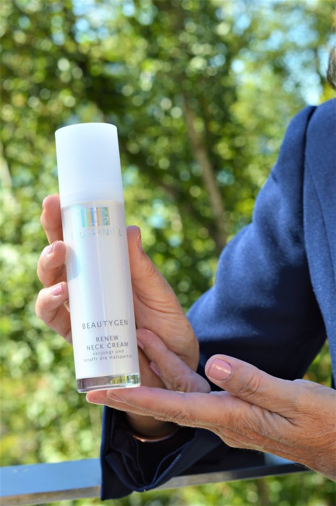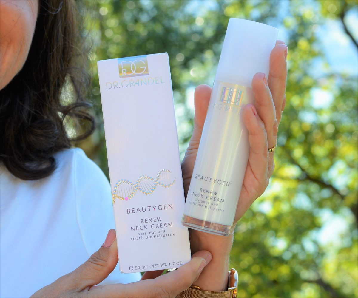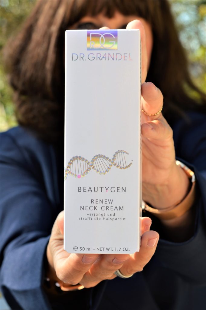 Die neuartige Halscreme Renew Neck Creme hat mich bei der Beschreibung und den Testergebnissen von Probandinnen sehr angesprochen. Verjüngende und straffende Halscreme, beschreibt Dr. Grandel die Creme. Dazu wollte ich mehr wissen, das muss ich ausprobieren.