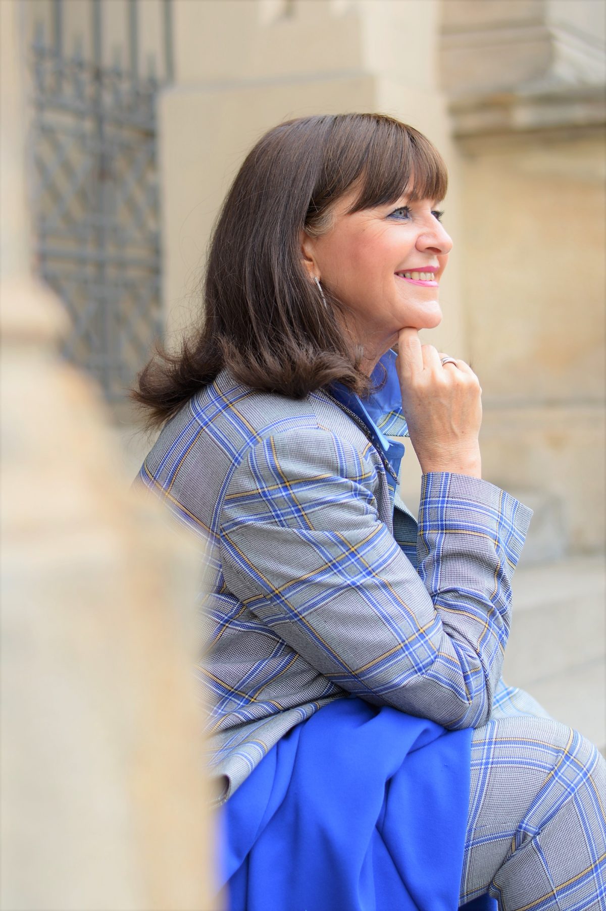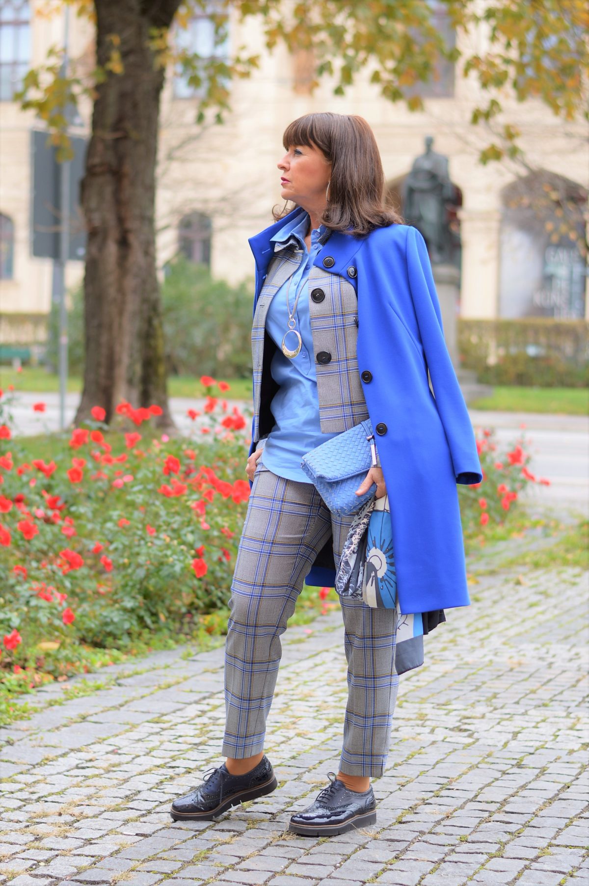 Mein Look setzt auf Akzente in Blautönen. Die Farbe der Bluse ergänzt sich mit dem Kontrast des Überkaros im Hosenanzug. Mein Übergangsmantel, den ich Euch am Sonntag in Kombination mit meinem Kleid vorgestellt habe, reicht bei den aktuellen Temperaturen völlig aus. HIER zum Anschauen.