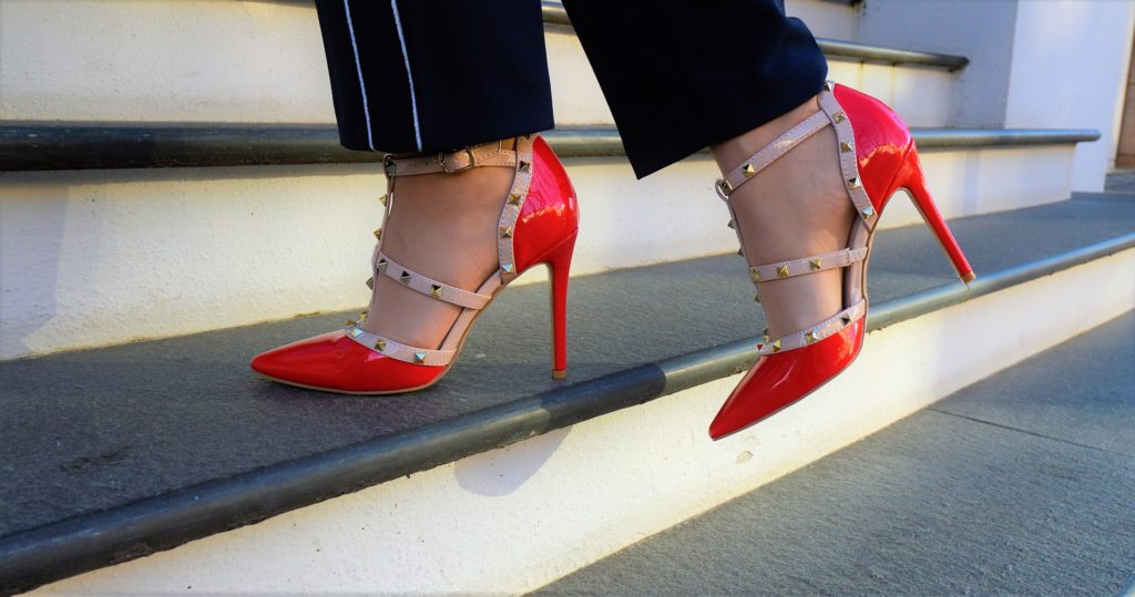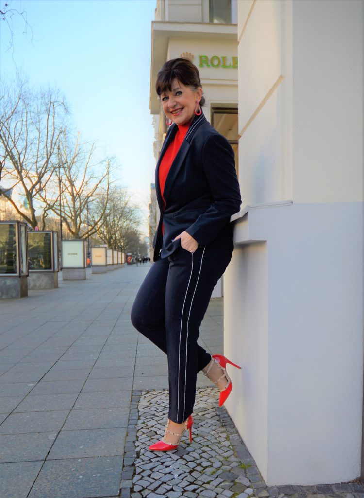 Gleich nach dem Büro treffen sich die Kollegen zu einem ungezwungenen Beisammen sein. Der schicke Hosenanzug lässt sich ganz einfach up-graden. Die flachen Büroschuhe werden gegen rote Highheels getauscht. Die weiße konservative Bürobluse wechsle ich gegen eine rote Bluse mit leichtem Stehkragen aus. So lässt sich aus dem seriösen Hosenanzug ein abendtauglicher Ausgehlook kreieren.