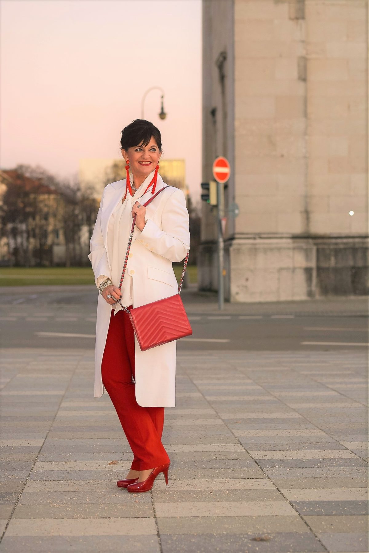 Die Farben rot und weiß passen perfekt zur Weihnachtszeit. Ob Firmen-Event oder Einladung zum Empfang. Eine rote Hose sieht mit einem außergewöhnlichen Gehrock faszinierend aus. Mit diesem Look geht niemand in der Masse unter. Da ich die Haare hochgesteckt habe, sind auffällige Ohrringe bei mir ein MUSS.