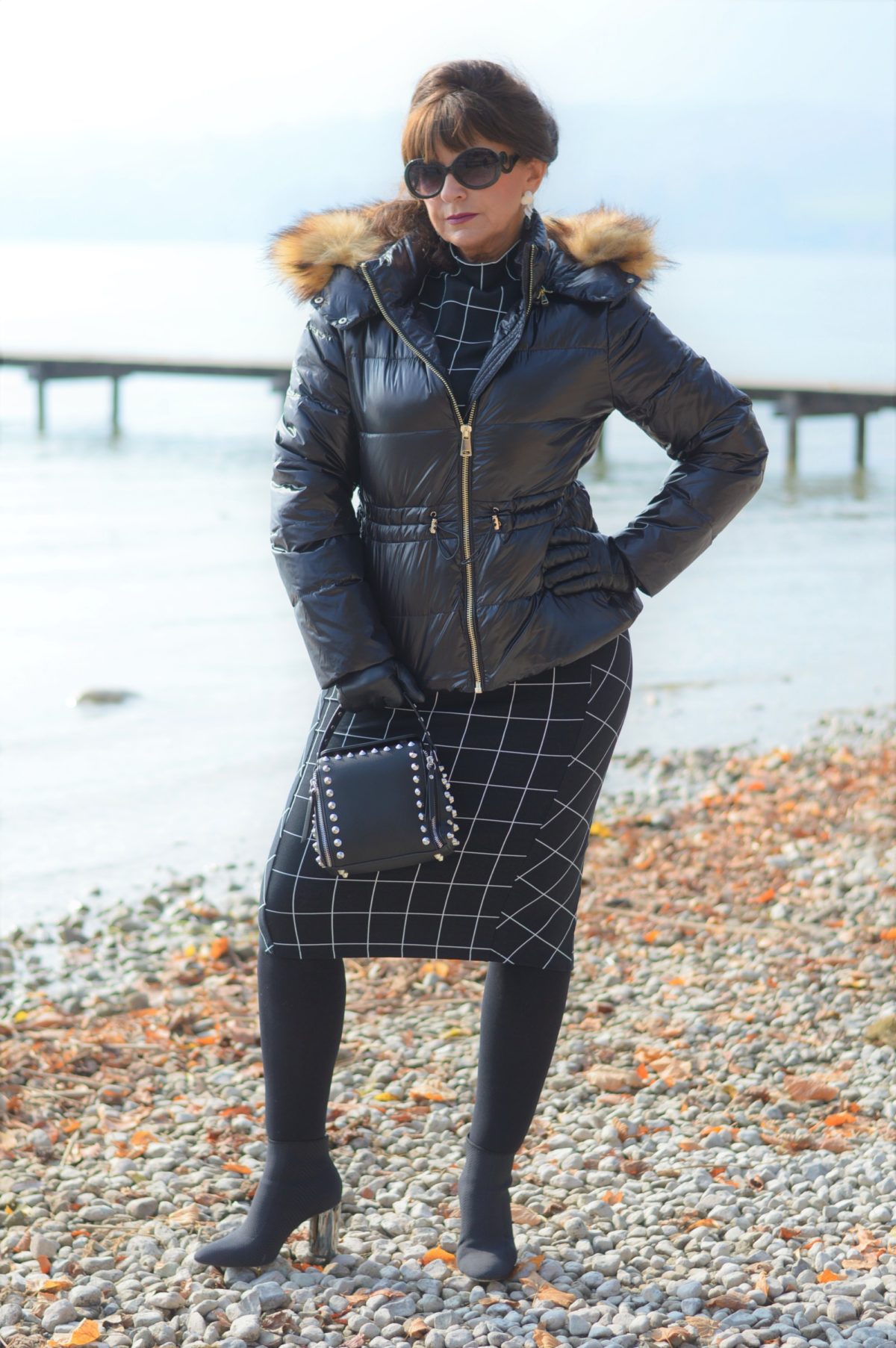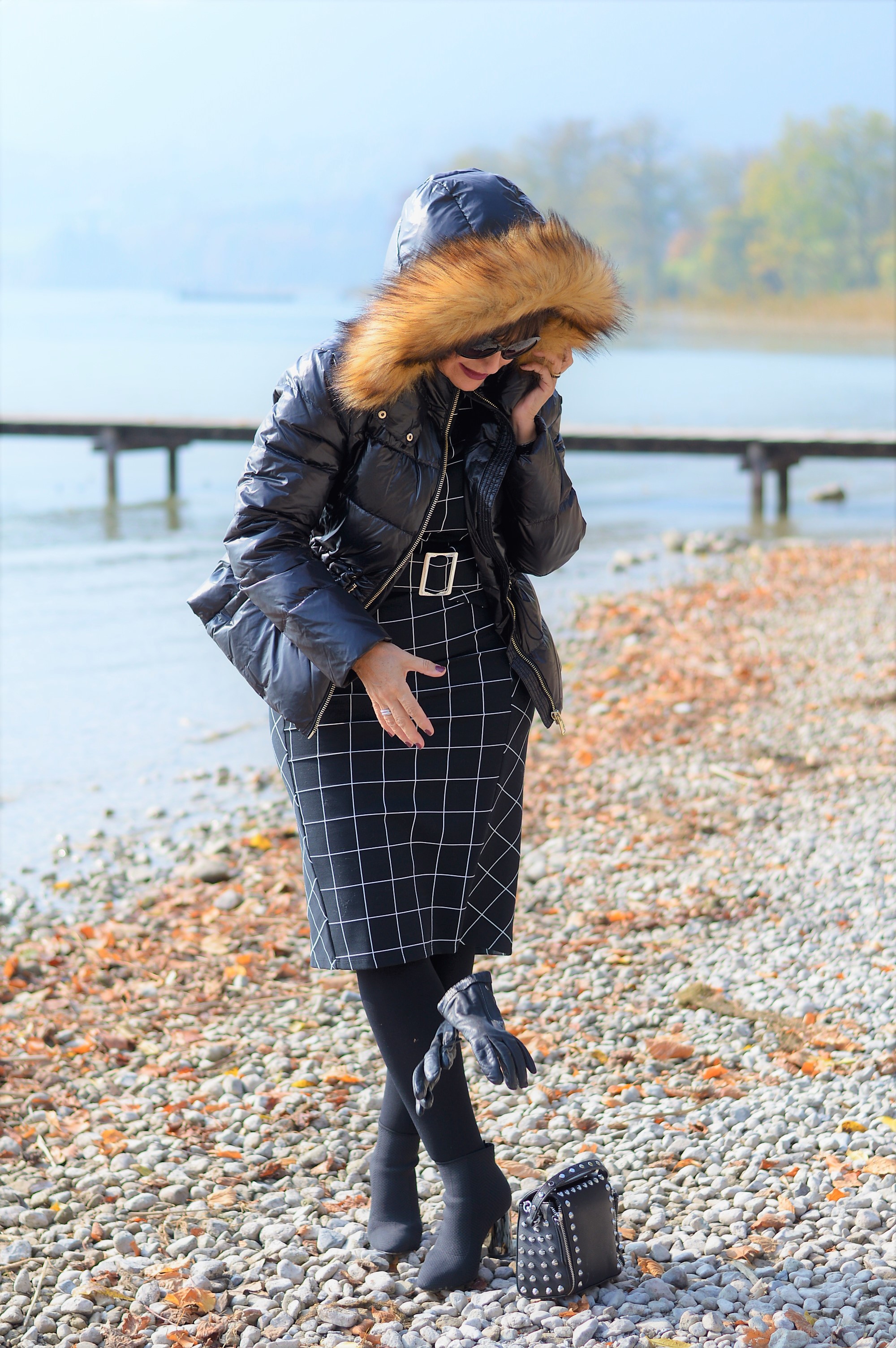 Früher habe ich zu Kleider immer einen langen Mantel getragen. Das kombiniere ich bei offiziellen Anlässen immer noch gerne zusammen. Mehr und mehr greife ich zu besonderen Eyecatchern, wie meine Daunenjacke mit innenliegenden verstellbarem Gürtel und Kapuze. Der Hingucker ist der Fellimitatbesatz, der die Kapuze ziert. Da macht es gar nichts aus, wenn es stürmt und schneit – ganz im Gegenteil.