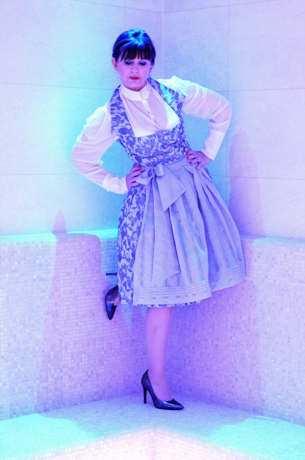 Einige Fotos sind im neu gestalteten Badebereich entstanden. Das blaue Licht hat mich fasziniert, ein Dirndl modern und außergewöhnlich in Szene zu setzen.