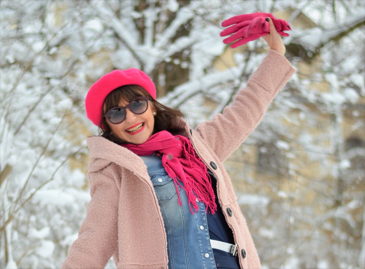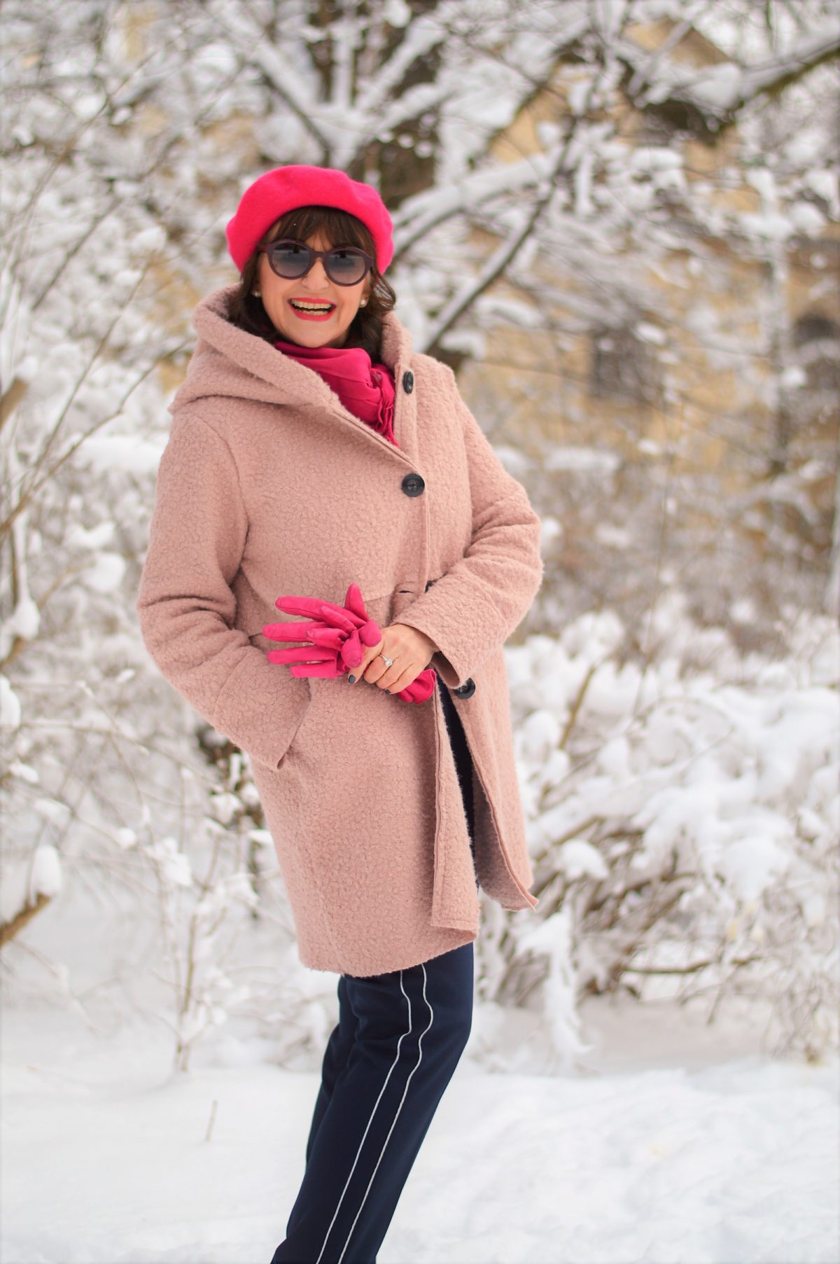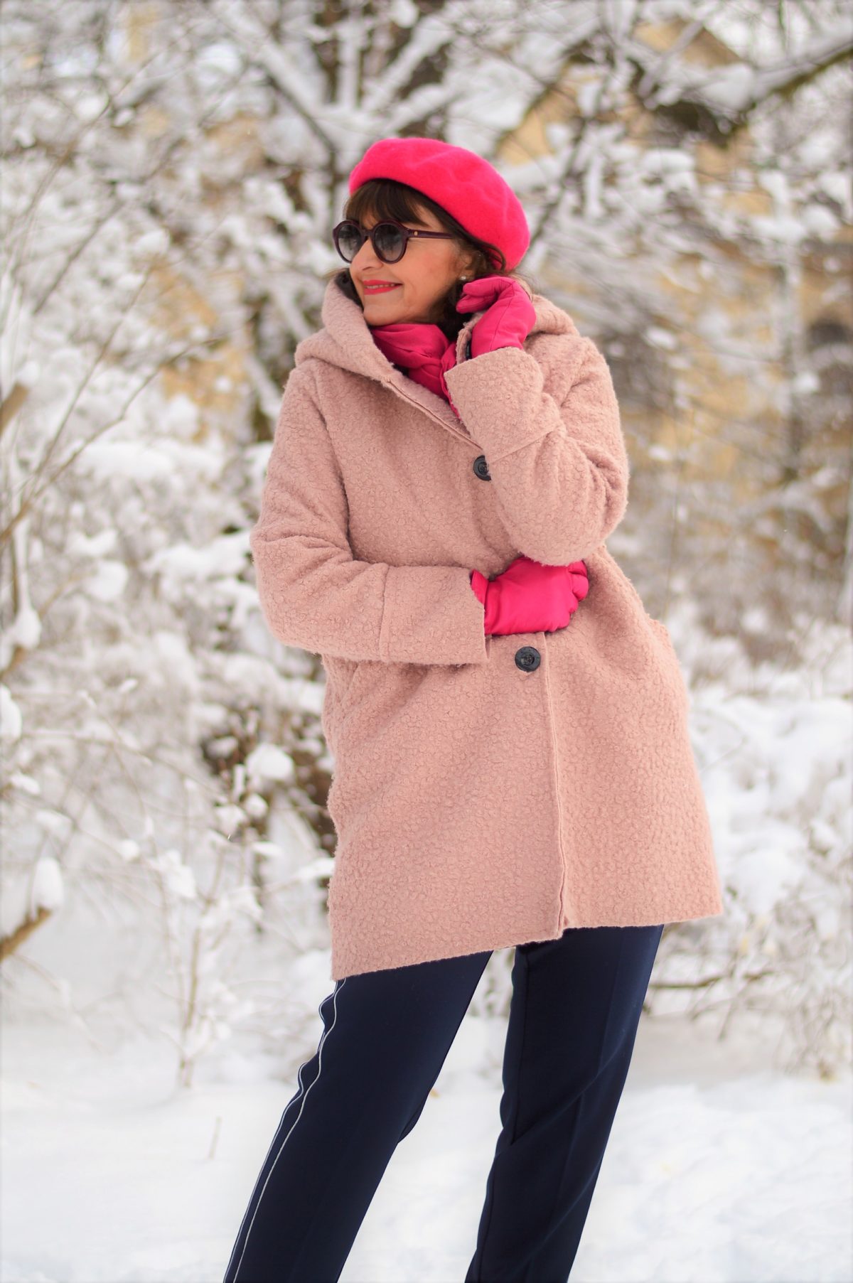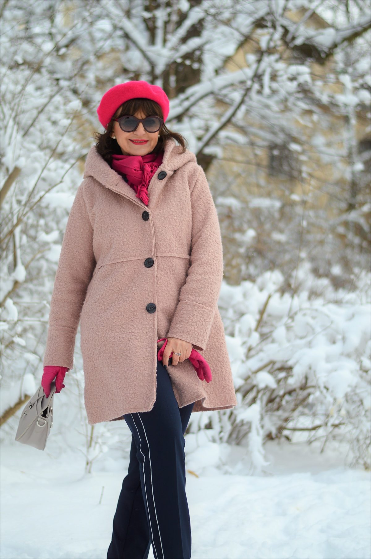 Zu meinem Wollmantel in zartem Rose kombiniere ich gerne kräftige Farben. Ein wunderschönes Pink ist mein Favorit in Sachen Hingucker. Die Handschuhe habe ich schon etwas länger. Das pinkfarbige Barett und der kuschelige Schal sind Geschenke von zwei meiner treuen Leserinnen – DANKE an Beate und an Astrid. Was für tolle Ladys meine Fans doch sind!