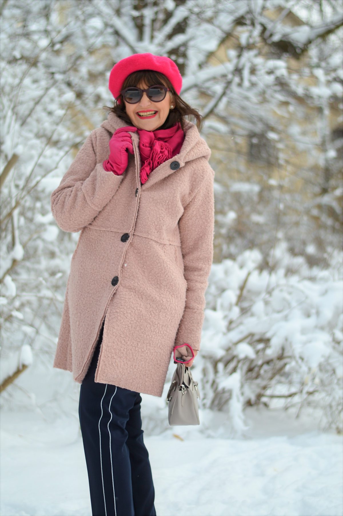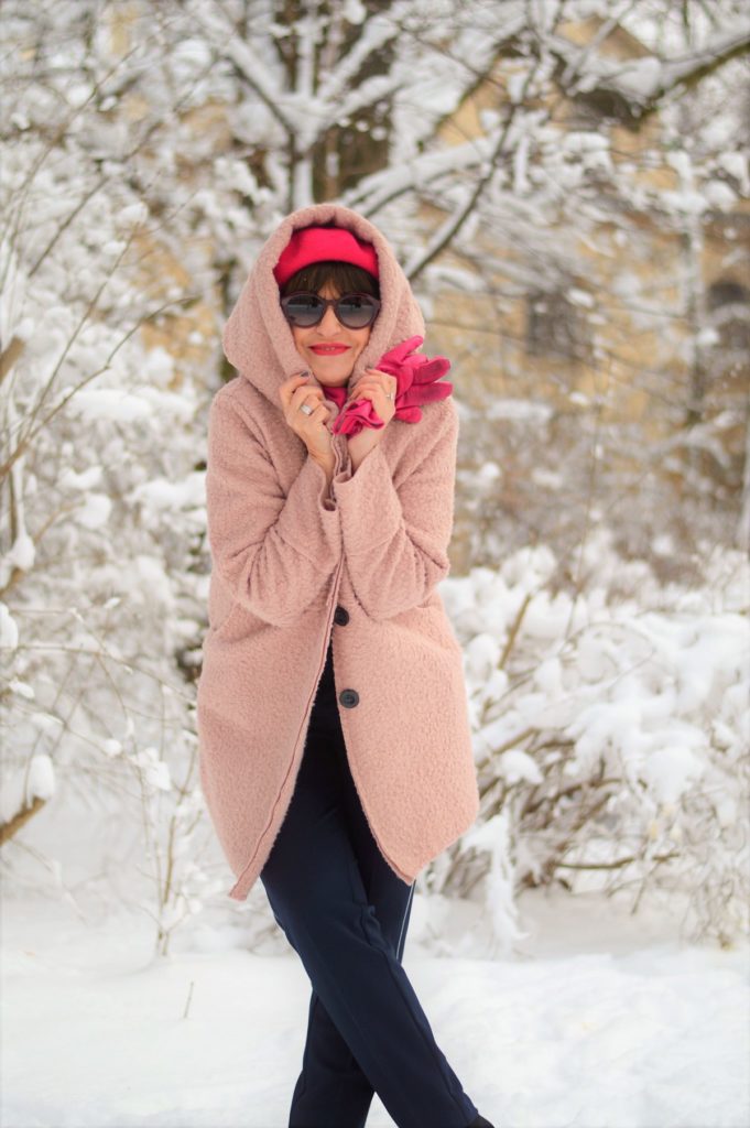 Zu meinem Wollmantel in zartem Rose kombiniere ich gerne kräftige Farben. Ein wunderschönes Pink ist mein Favorit in Sachen Hingucker. Die Handschuhe habe ich schon etwas länger. Das pinkfarbige Barett und der kuschelige Schal sind Geschenke von zwei meiner treuen Leserinnen – DANKE an Beate und an Astrid. Was für tolle Ladys meine Fans doch sind!