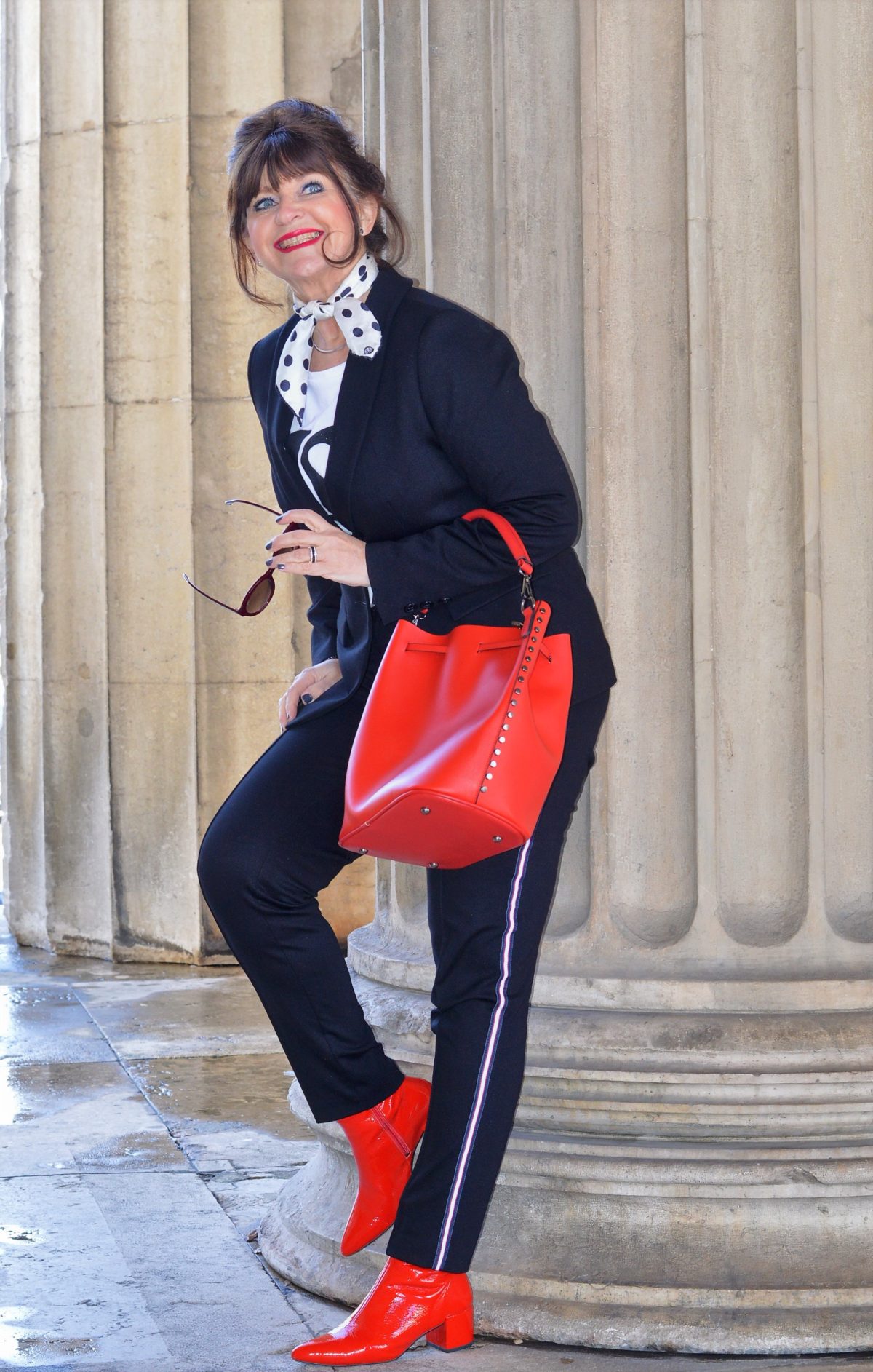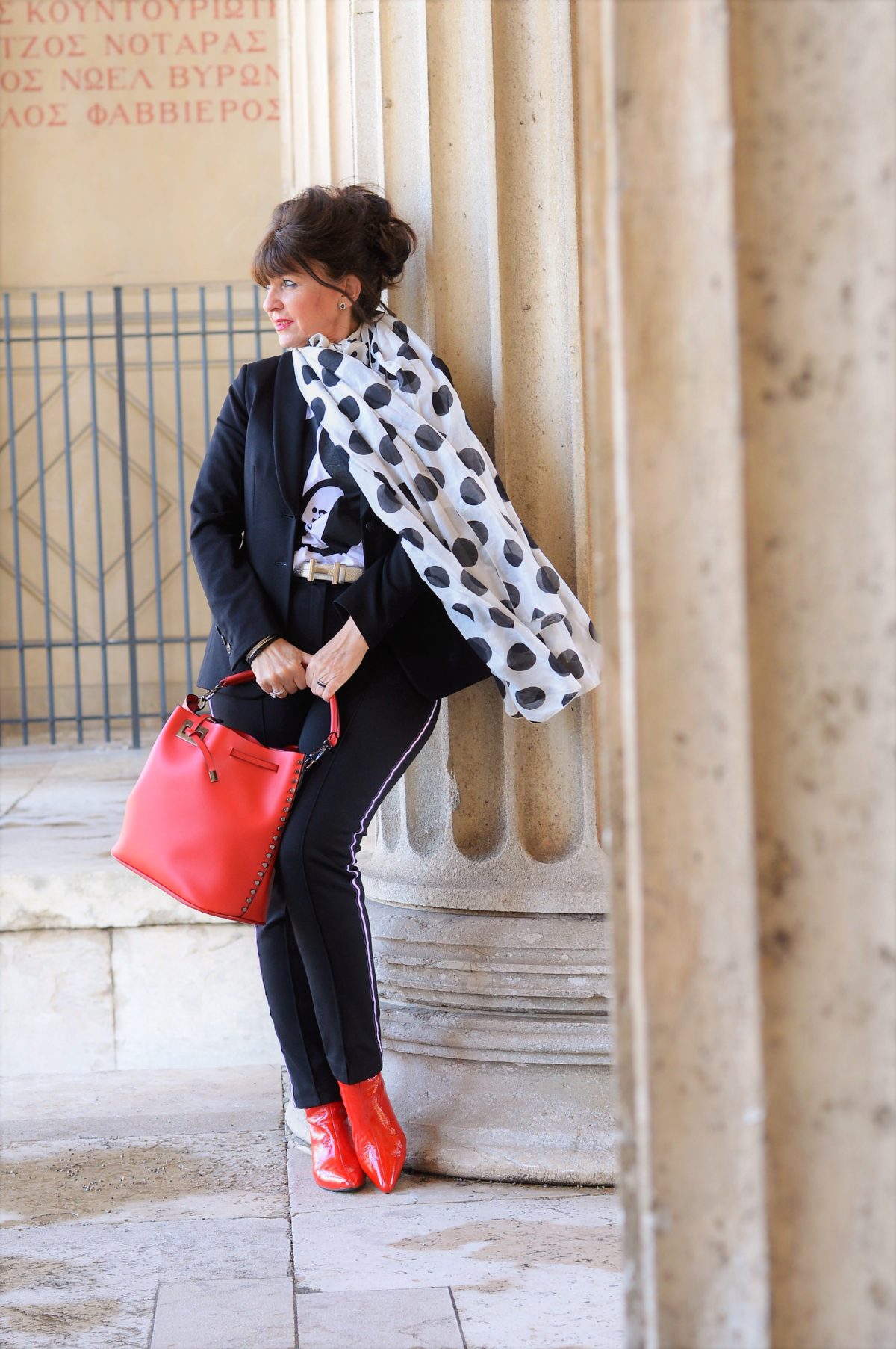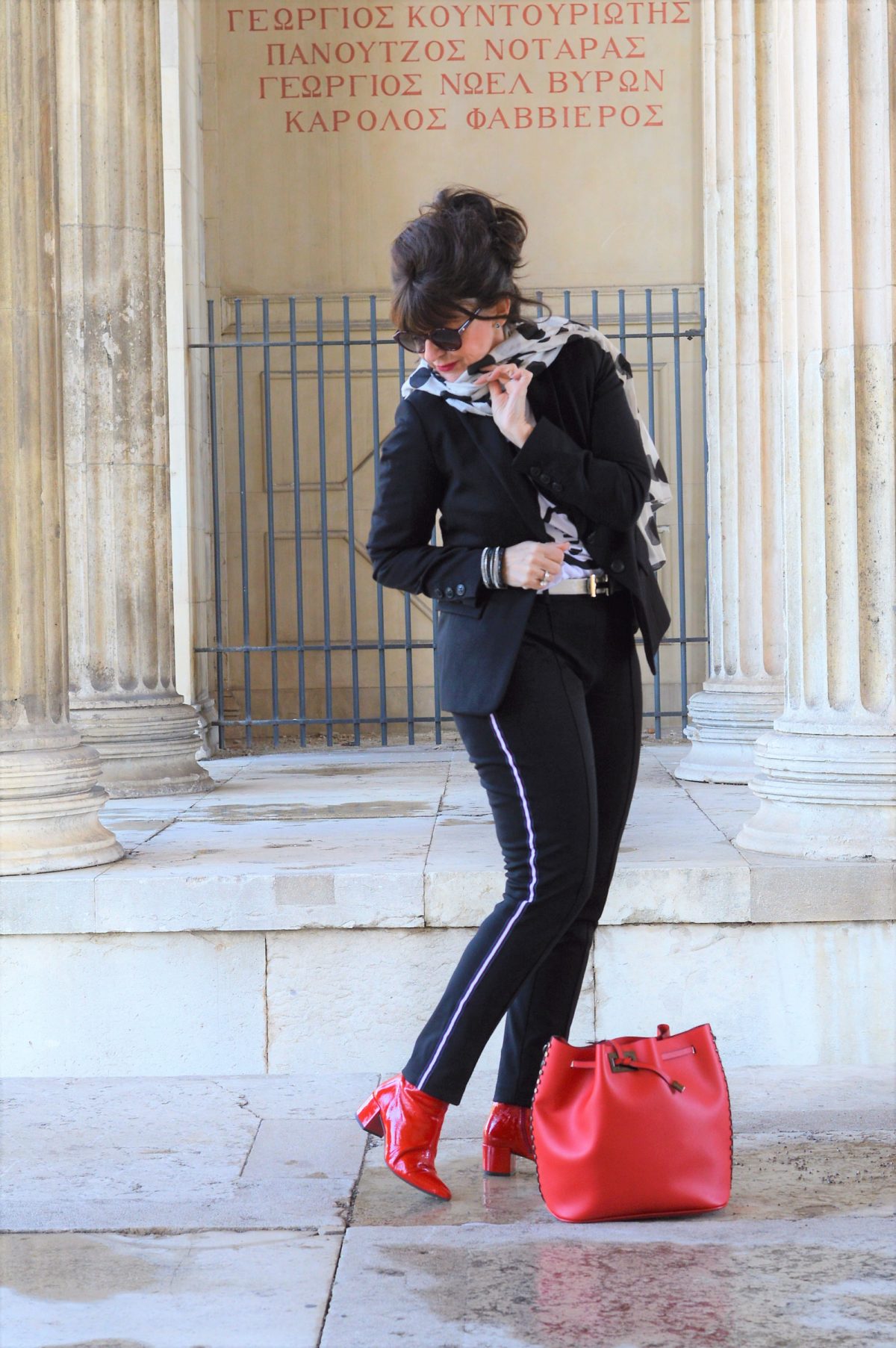 Meine Hose ist mit angesagten Gallonstreifen versehen. Die Farbe, die den Streifen ziert, habe ich in meinen Stiefeletten und meiner City-Bag aufgegriffen. Durch das fröhliche Rot bekommt mein Outfit schon einen leichten Hauch von Frühling.