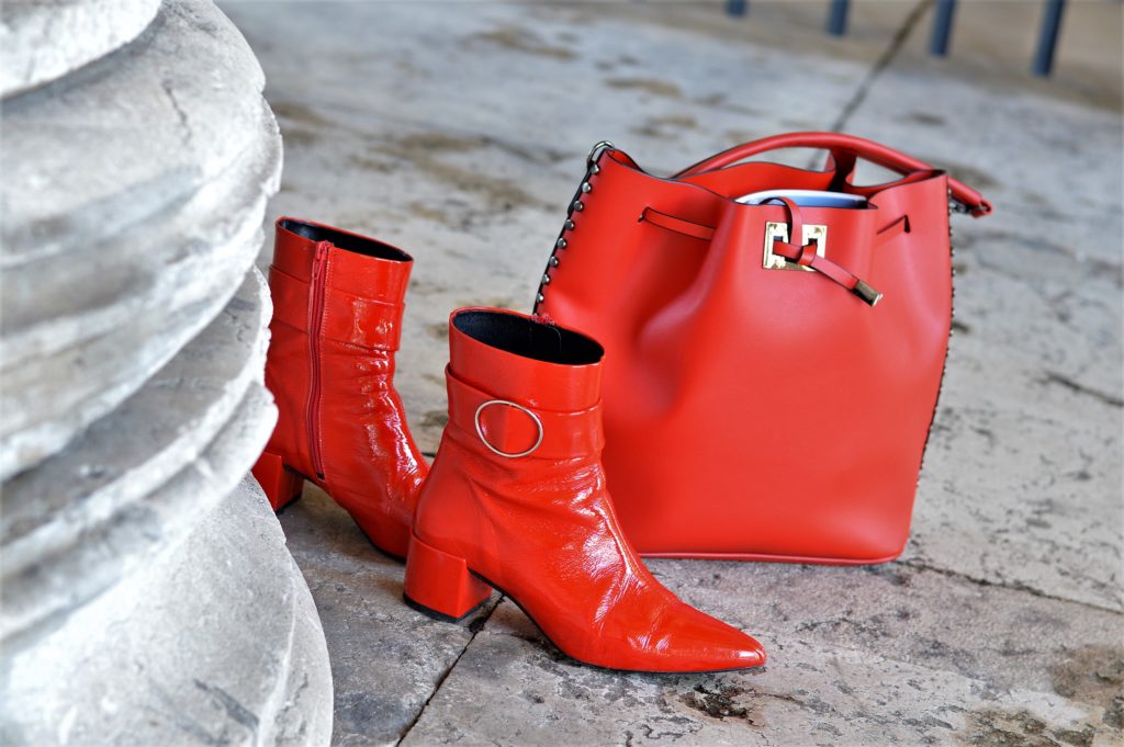 Die Tasche und die roten Stiefeletten aus Rindlack-Leder habe ich Euch auf Instagram bereits in einer anderen Kombinationsmöglichkeit vorgestellt – und es hat großen Zuspruch dafür gegeben. Die Stiefelette ist extravagant und durch die spitze Form ein absolut modischer Hingucker. Jedes Outfit bekommt damit die extra Portion von Individualität. Sicherlich nicht jede Lady traut sich an diese Accessoires, aber es soll Dir Inspiration für Deinen eigenen Look geben.