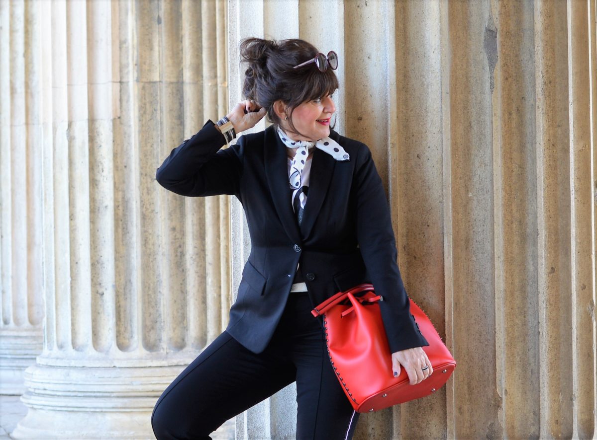 Der edle Begleiter zum Dinner, ins Theater oder zum Sonntags-Brunch. Die schwarze Hose sieht mit einem farblich frischen und hellem Blazer immer gut aus. Der Look wirkt clean und gibt einer schwarzen Hose einen eleganten Ausdruck. Stimme Deine Schuhe perfekt auf die Farbe des Blazers ab und der Look wird zum Hingucker. Ein edles Seidentuch mit angesagtem Kettenprint oder mit auffälligen Polka-Dots wäre mein spezieller Styling Tipp on top.