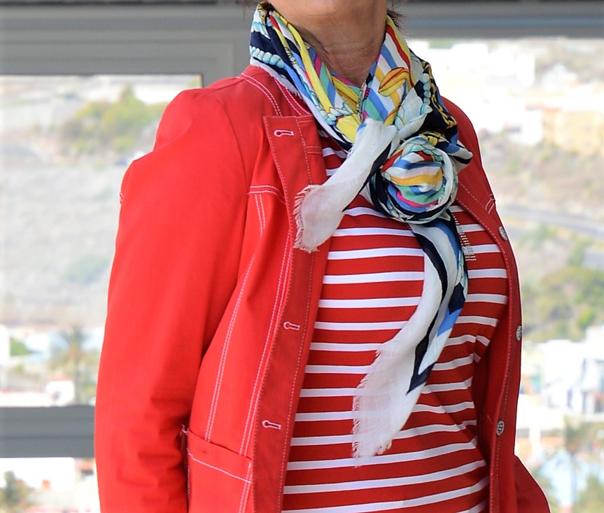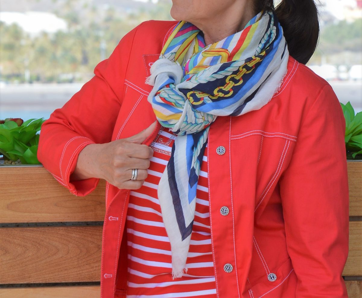 Um den maritimen Look stilvoll zu kombinieren, ist ein ausgeglichenes Verhältnis von Streifen und einfarbigen Teilen wichtig. Der schlichte Look von Shirt und Jeans wird mit einer roten kurzen Jacke aufgehübscht. Durch mein Halstuch mit maritimen Motiven wirkt der Look absolut stimmig.