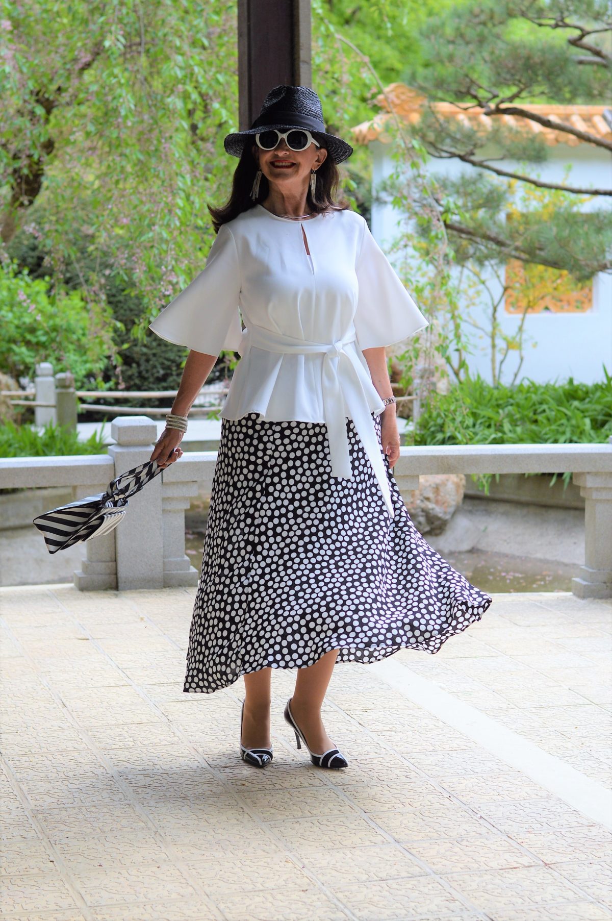 Die Accessoires sind wie immer mit Bedacht gewählt. Schuhe in black-and-white Optik werden mit einer gestreiften Handtasche kombiniert. Die weiße Sonnenbrille und der passende Hut runden meinen Frühlingslook perfekt ab. Durch die klassischen Farben in der Garderobe kann ich meinem Gespür und Geschmack für Accessoires freien Lauf lassen.