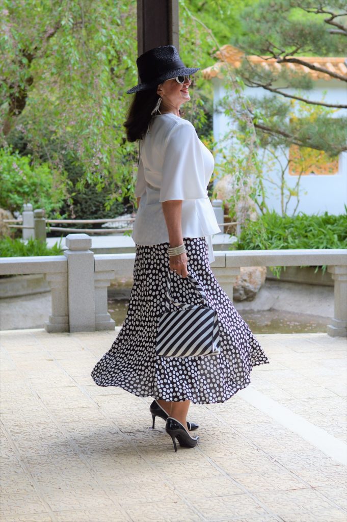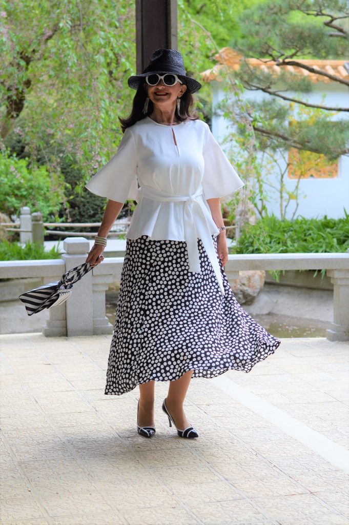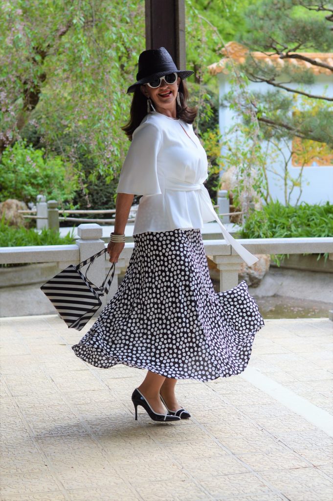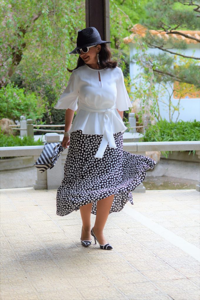 7 Looks für 7 Tage Rock mit Polka DotsDie weiße Bluse mit dem modischen Schößchen wird sehr feminin. Die Ärmel sind extravagant in der Schnittführung und ein gewisser Hingucker. Dezent wird die Bluse in der Taille gebunden. Leicht und luftig ist das Material, so dass ich die Bluse auch an heißen Tagen uneingeschränkt tragen kann.