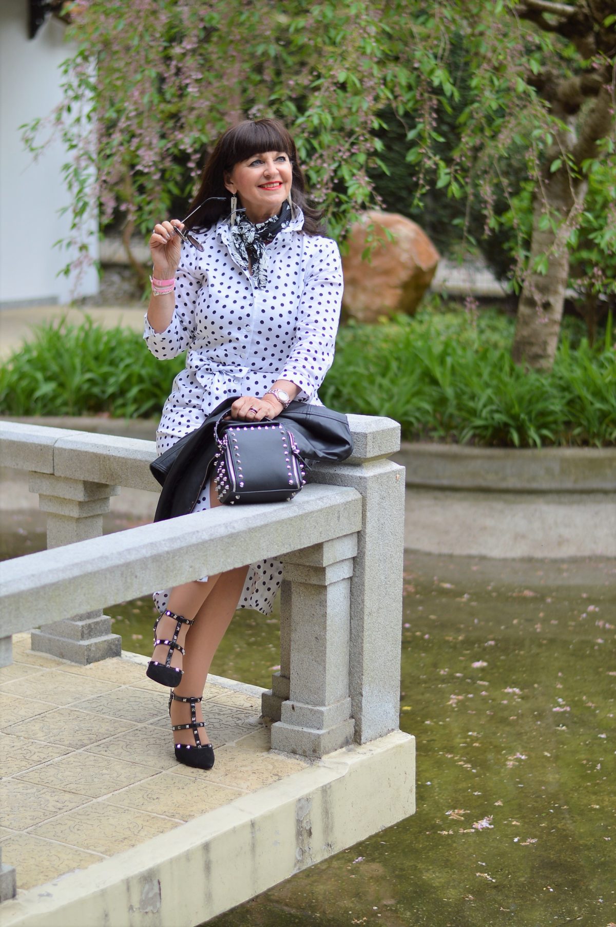 Einen rockigen Touch bekommt mein Look durch die schwarze Lederjacke. Der Stilbruch lässt das feminine Hemdblusenkleid dadurch modern wirken. Mit einem schlichten Blazer in weiß oder schwarz wird der Business Look kreiert. Je nach Anlass, je nach Job, je nach Lust und Laune – mit einem Kleid mit Polka Dots ist so vieles möglich.