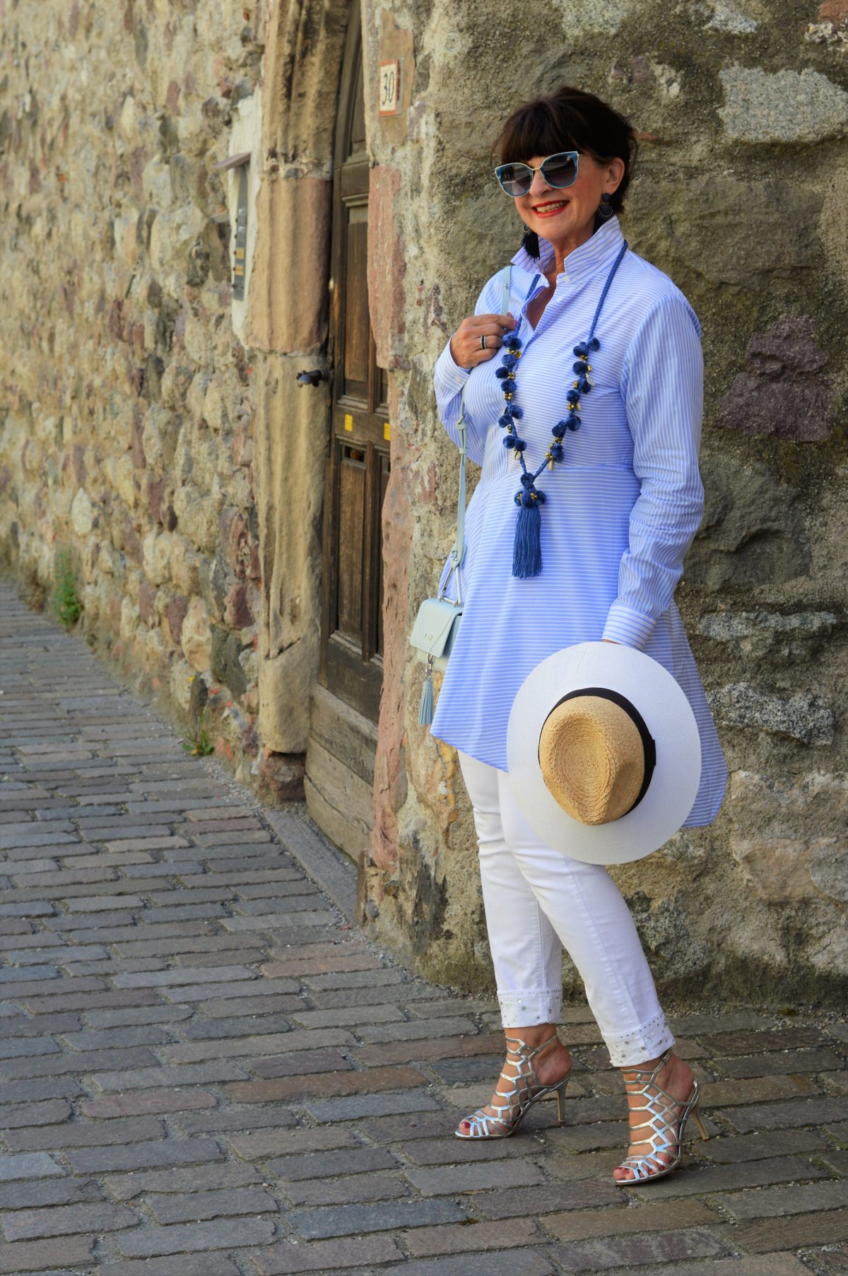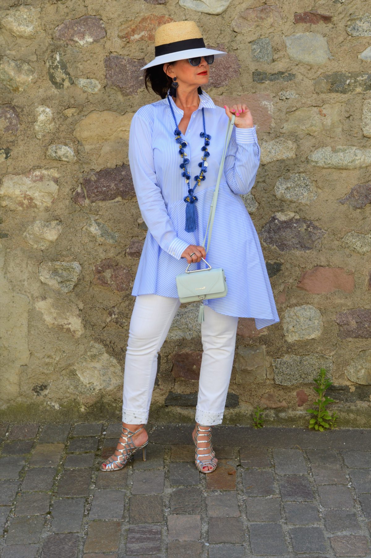 Im Urlaub habe ich das schicke Blusenkleid sogar solo als Kleid getragen. Für mich eine Variante, die ich wirklich nur in der Freizeit wähle. Die rückwärtige Seite ist etwas länger geschnitten, als die Vorderseite des Trendteils.