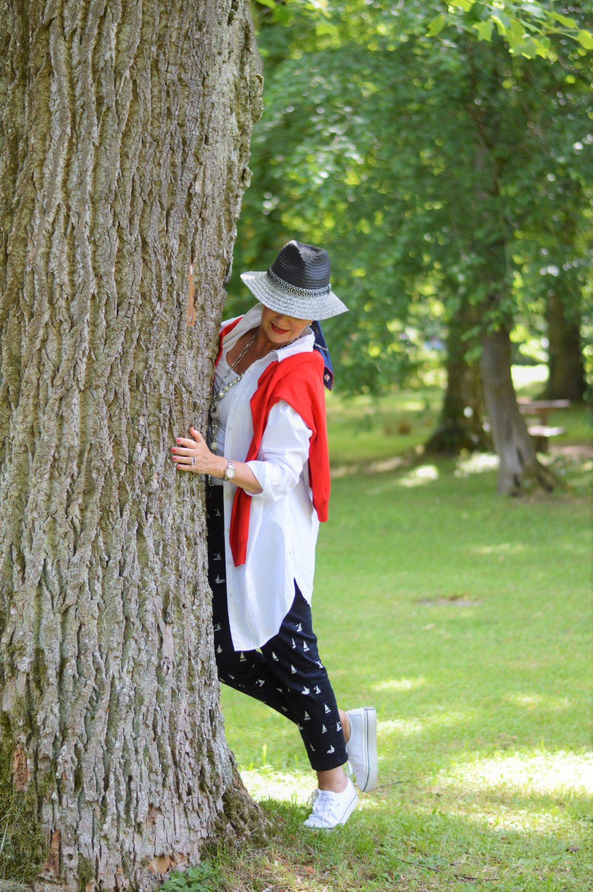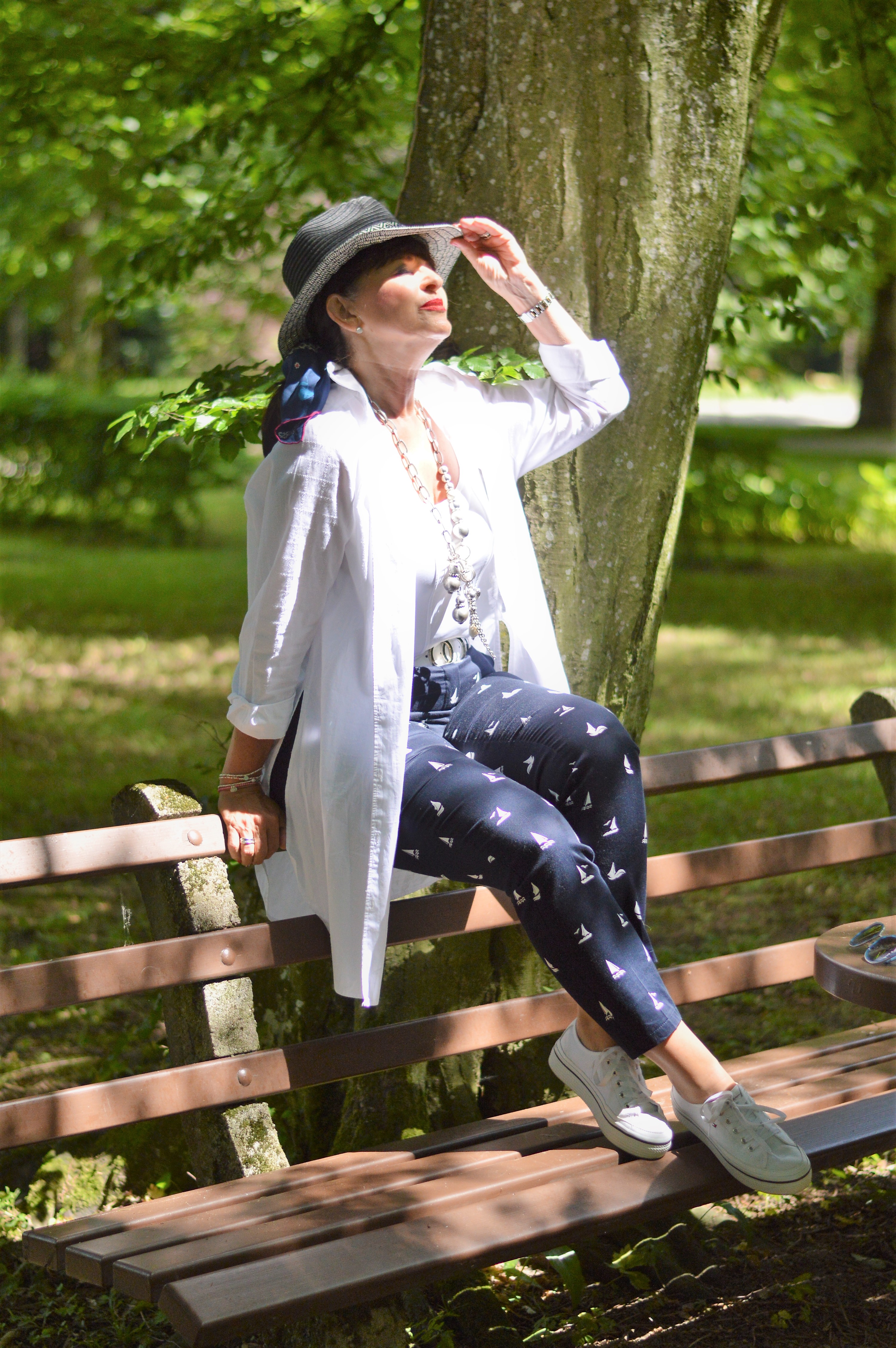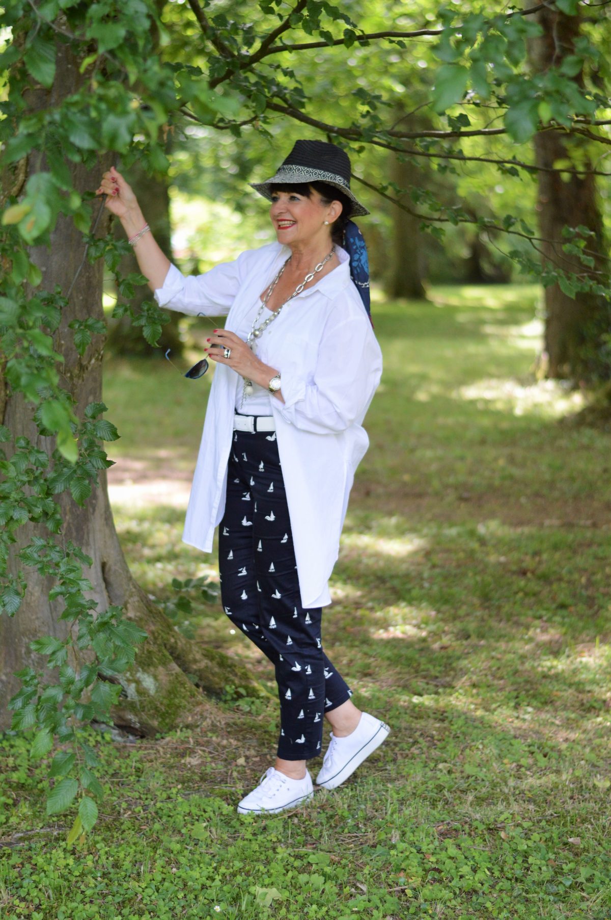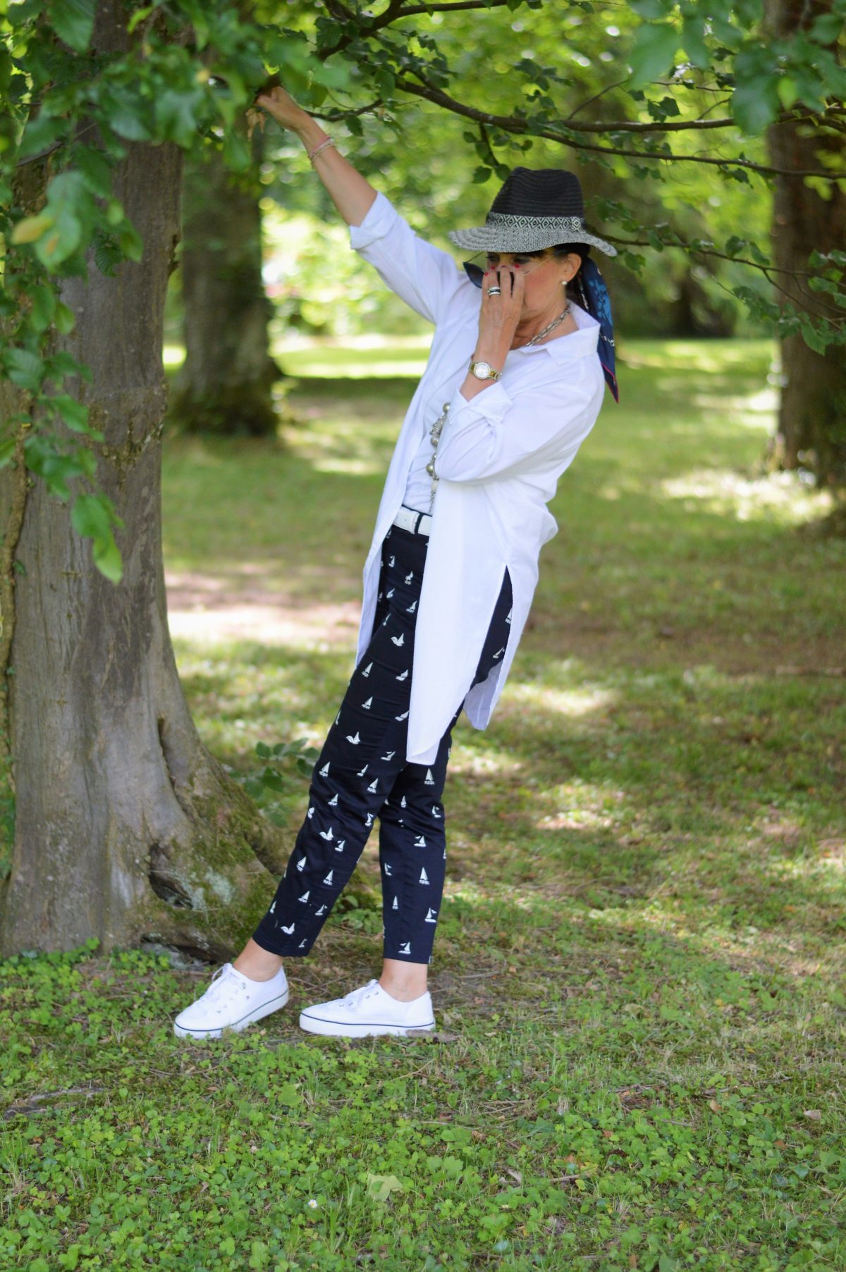 Außerdem mag ich Deinen Look mit der blauen Hose mit dem weißen Muster total gerne.