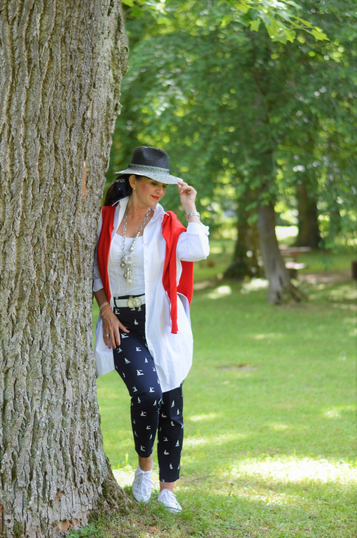Entspannt den Sommer genießen. Das kann ich zur Zeit ganz gut. In meinem Kalender habe ich mir einen Tag nur für mich eingetragen. Mein Look ist casual und leger. Die blaue Baumwollhose ist mit weißen Segelmotiven verziert. Die weiße Longbluse trage ich offen, quasi als Jackenersatz. Darunter kombiniere ich ein weißes Top.